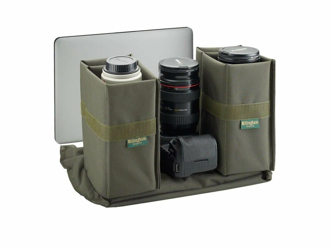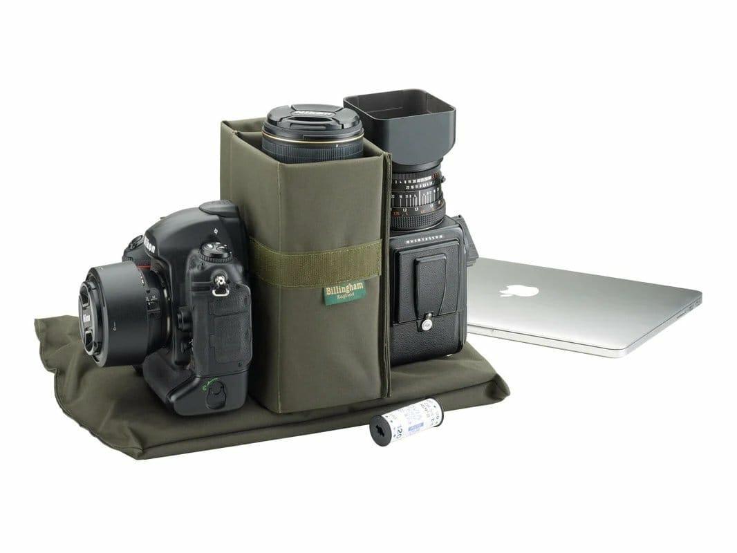 DSLR with a lens attached (e.g. Canon 1DX, Nikon D6, Canon 5D, Nikon D850) plus 1-3 lenses depending on their size. Tall enough for a 70-200mm lens not attached to camera.