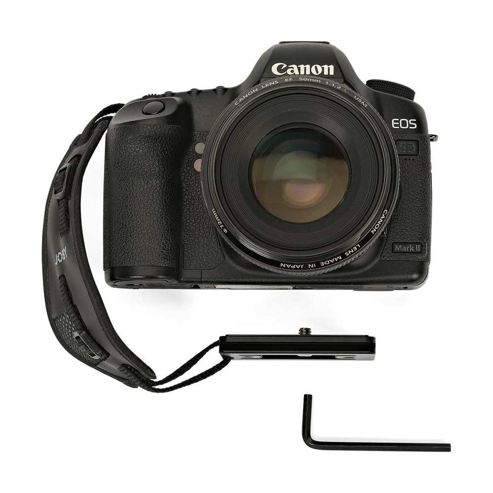 Strength, comfort and customization are the backbone of this hand strap for cameras and quick release plate. The Arca-Swiss compatible plate allows it to attach to most tripods, while extra mounting holes opposite the handle let you attach extra accessories like a sling strap.