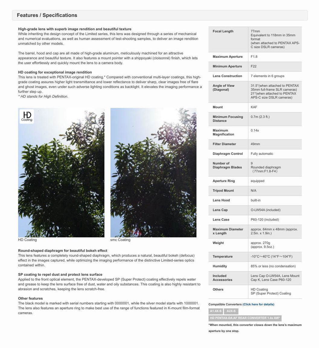 77mm F1.8全片幅中遠距離鏡頭\n機身連動對焦\n6組7片日本玻璃設計\n9片光圈葉組件\nHD Coating多層高清高透光率鍍膜\nSP(Super Protect)鍍膜,防止水, 防油漬鏡面\n全天侯防塵和-10度耐寒結構\n附送遮光罩