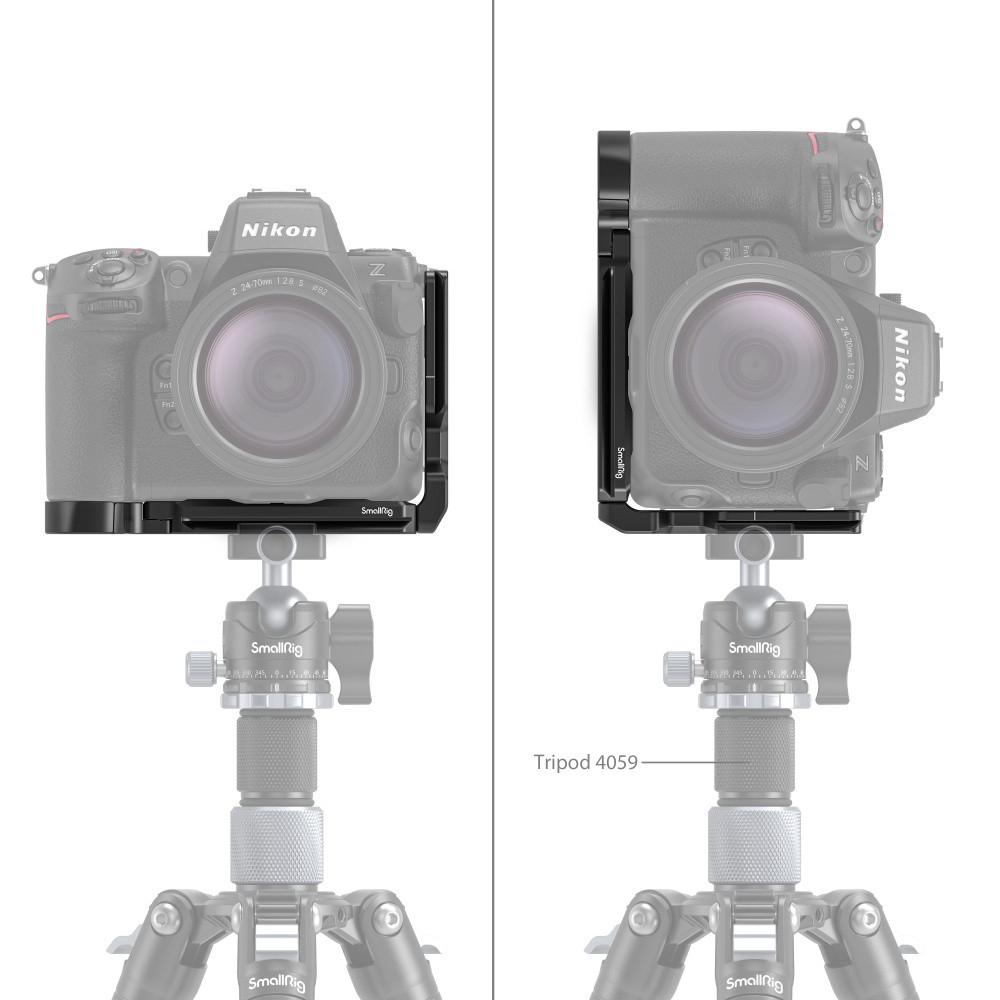 SmallRig L-Bracket for Nikon Z 8 3942 is designed to facilitate a switch between horizontal and vertical modes and to improve grip experience. It locks the camera via one 1/4 "-20 screw at the bottom and one locating pin, with rub pads preventing scratches, and has a hinge arm at the battery door that fits the camera curve to enhance grip. There are multiple accessory mounts: an Arca Swiss quick-release plate for Arca-type tripods or DJI RS 2 / RSC 2 / RS 3 / RS 3 Pro gimbals, 1/4"-20 & 3/8"-16 threaded holes at the bottom that support Side Handle 2093 & 3847, Quick Release Plate 1280, and strap holes for Hand Strap 3848 & 2456. The L-Bracket also features a QD mount to attach the QD strap buckle, 1/4"-20 threaded holes, suitable for Cold Shoe Mount BUC2736 for the microphone, as well as a 23mm stretchable side plate that allows cables through in vertical shooting. Besides, a magnetic wrench is included for easy disassembly and assembly.