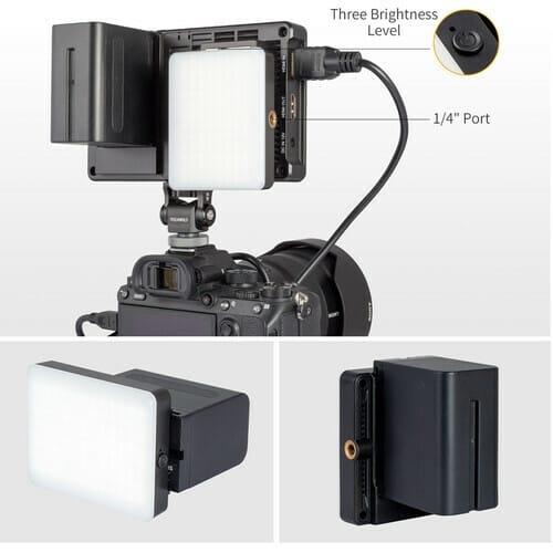 The F5 PRO V3 provides a exquisite fill light, it features 96pcs LED beads and three adjustable brightness level, meet the needs of shooting supplementary light. You can install it on the F970 external power and installation kit which on the rear of monitor and power it via DC IN 12V or battery. The side of fill light also with a 1/4” mounting screw thread, it can mount hot shoe, magic arm, etc.
