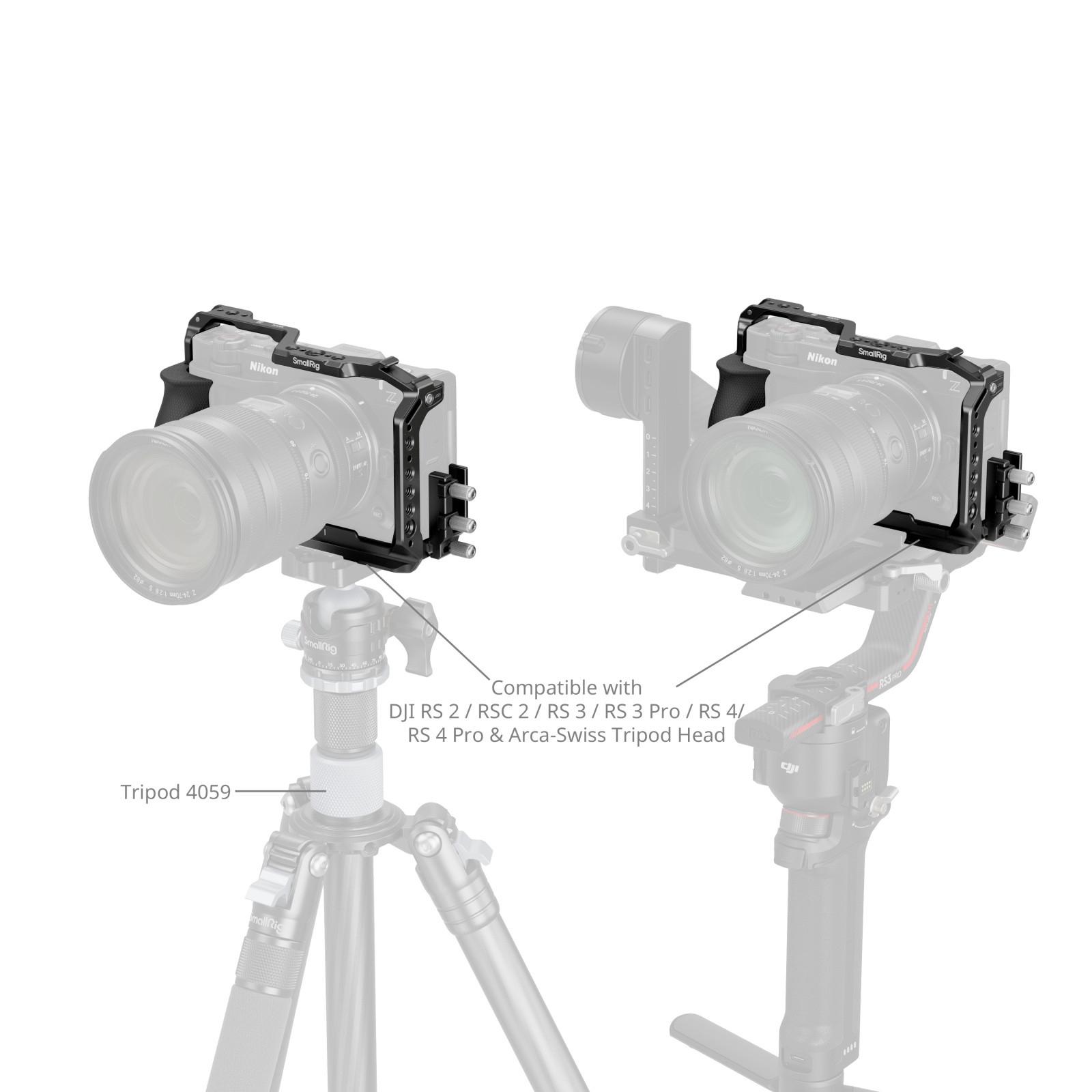 The base features a built-in Arca-Swiss quick release plate, allowing for instant mounting on Arca-type tripods (ID 5290, 4222B) or DJI gimbals (RS 2, RSC 2, RS 3 Pro, RS 4 Pro) for rapid setup transitions.