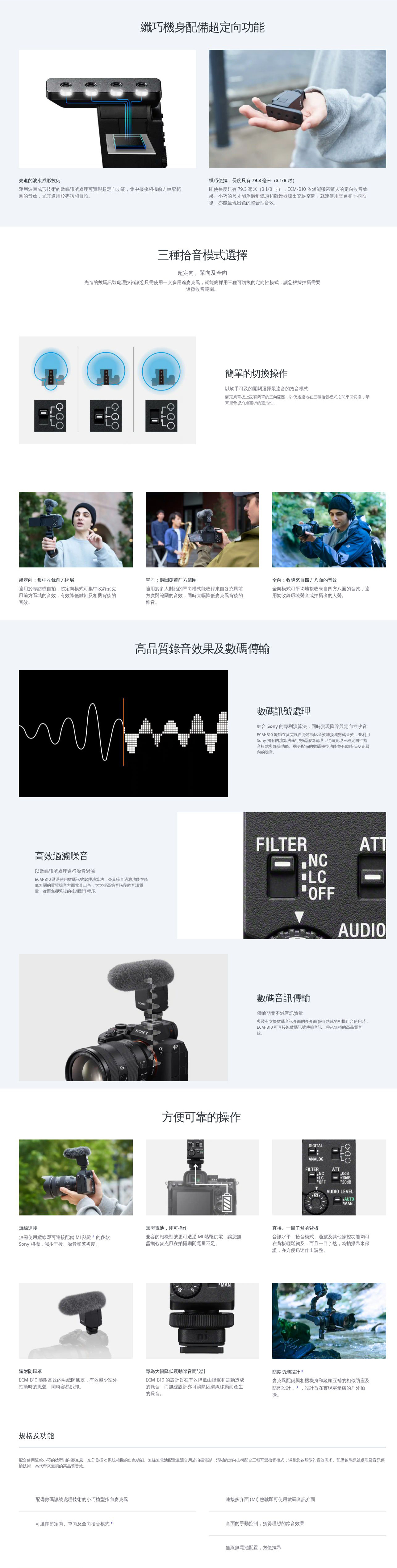 小巧而效能出眾的槍型指向麥克風,提供三種可選拾音模式\n這款效能出眾的槍型指向麥克風小巧便攜,無線無電池設計最適合拍攝電影。數碼訊號處理技術配合 Sony 的獨有演算法,帶來出色的音訊表現並提供三種可選定向模式。