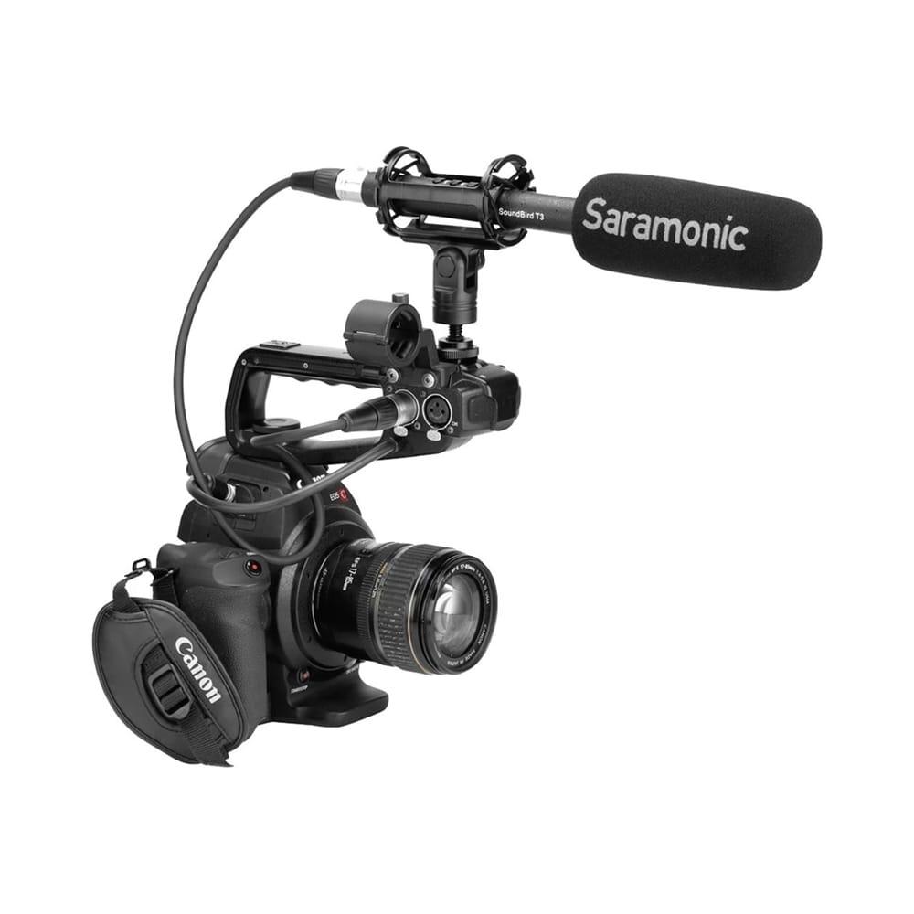 Saramonic SoundBird T3是指向槍型麥克風,具有心形指向性,內置可充電電池,150 Hz低切開關,+6dB高頻增強,-10 dB PAD和電源按鈕。