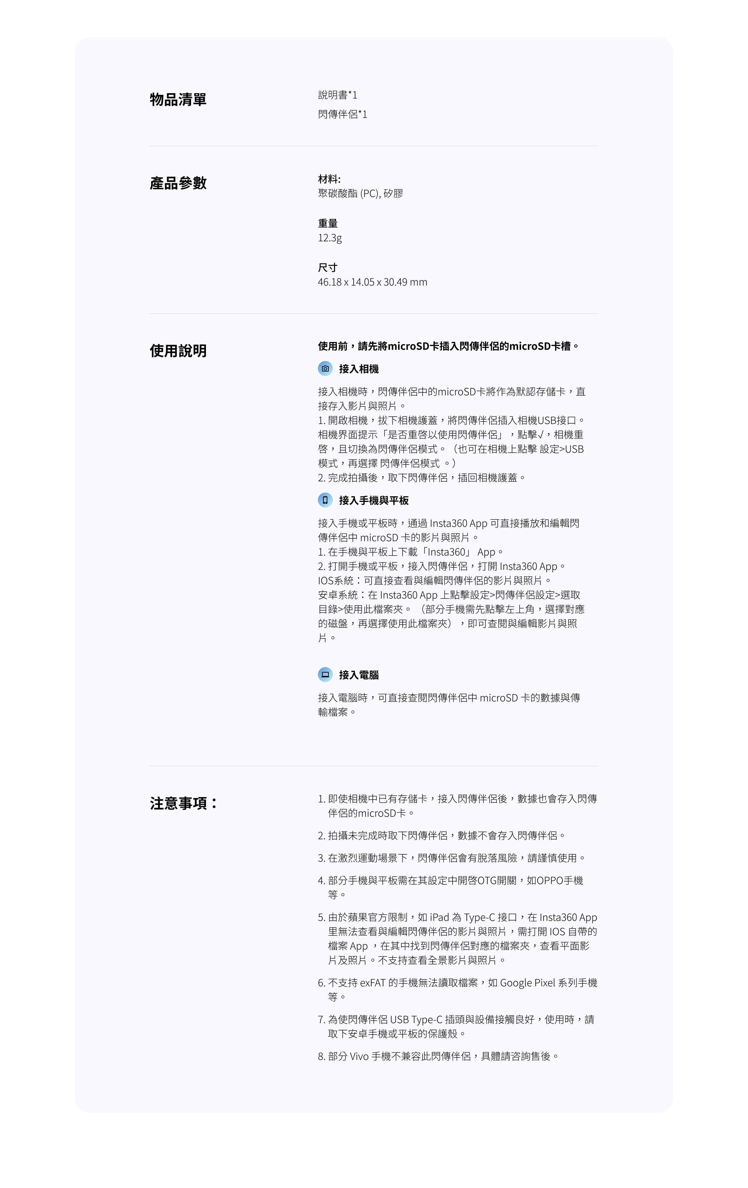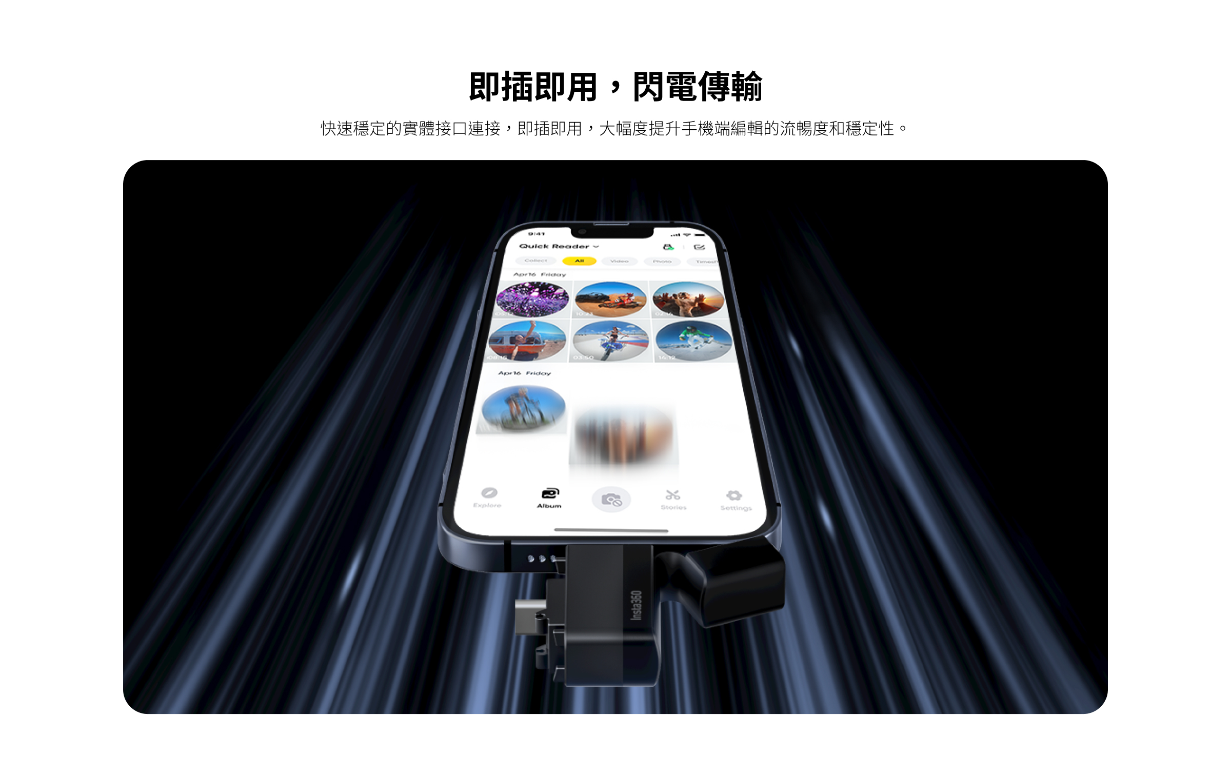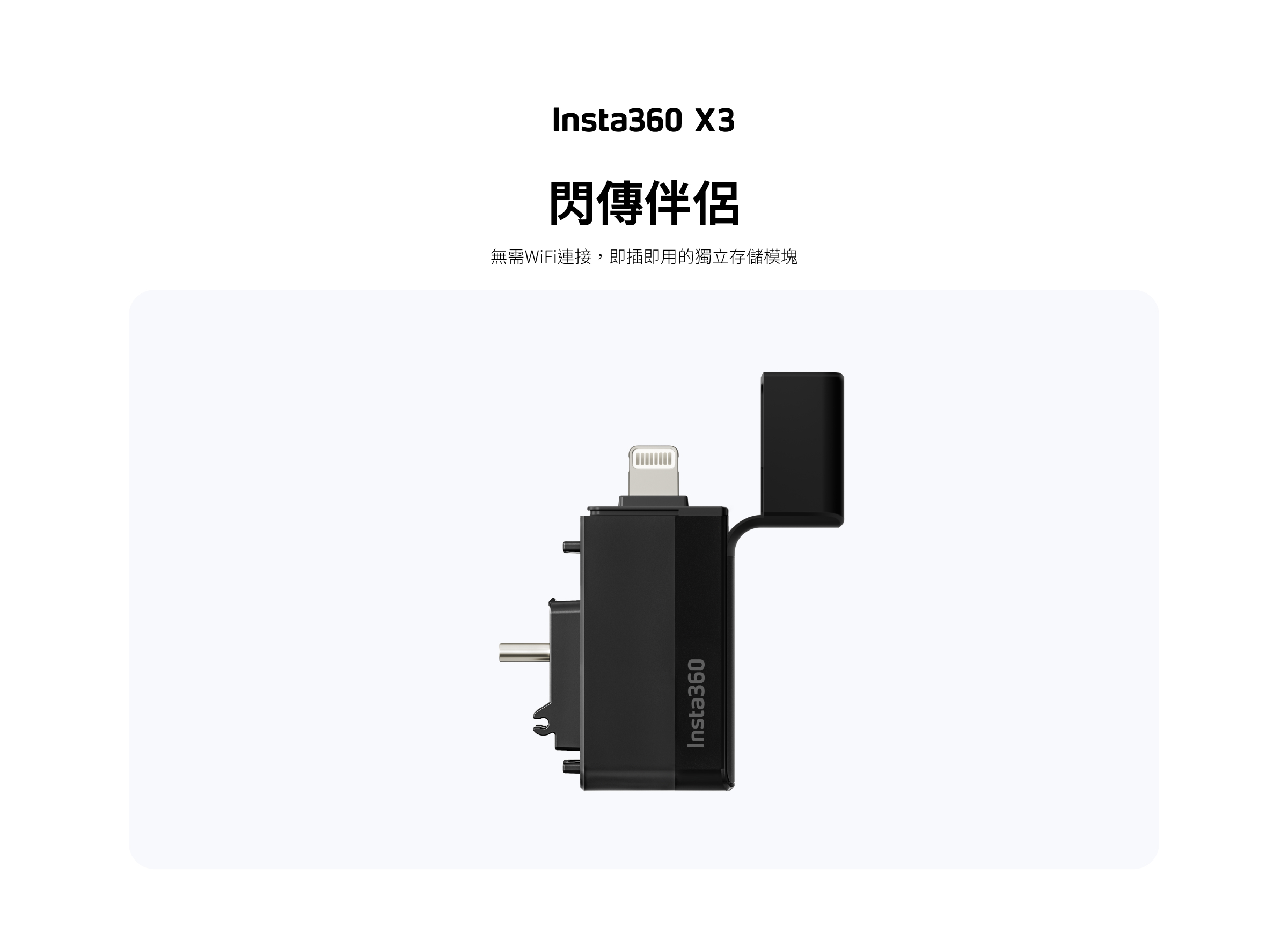 無需WiFi連接,即插即用的獨立存儲模塊。\n直連手機,大幅提升APP剪輯的流暢度與體驗。\n適配IOS(蘋果MFI認證)和Android設備。