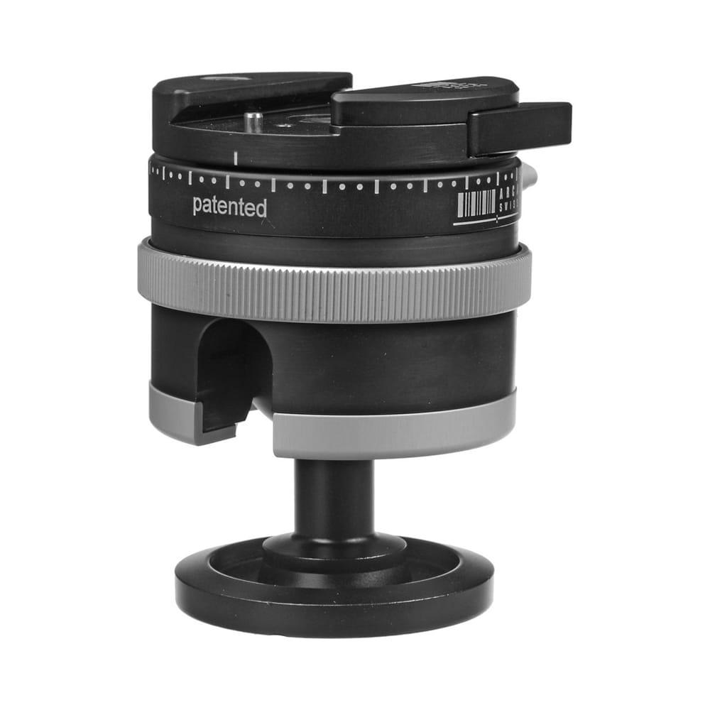The Arca-Swiss Monoball P0 Tripod Head Panning System and Slidefix QS Quick Release System is a unique knobless tripod head featuring a design that abandons traditional locking knobs and replaces them with a three-element geared locking system. This system allows the head to be positioned at any angle. The Monoball P0 locking elements apply a uniform force around the ball ensuring smooth camera movements in any axis. When the camera is placed directly on the ball and not on its neck, the movements are as stable as if they were on a rubber ring. The aspherical ball also prevents sudden camera movements.