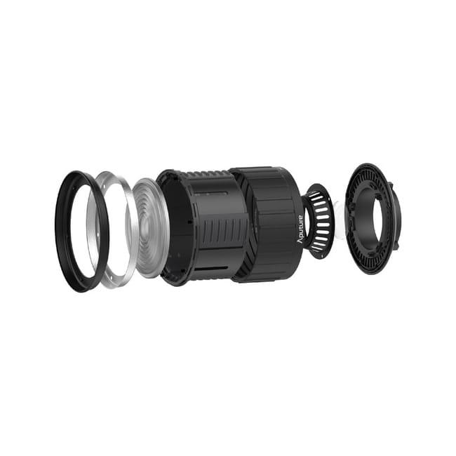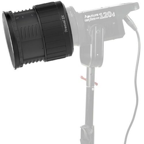 The rear lens focuses and magnifies the beam onto the larger 5.5” front Fresnel lens, maximizing light utilization. Our dual lens optical design makes the Fresnel 2X twice as powerful as the original Aputure Fresnel, and makes the 120d II almost 10 times brighter than with the reflector.