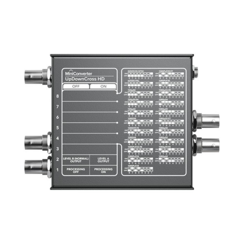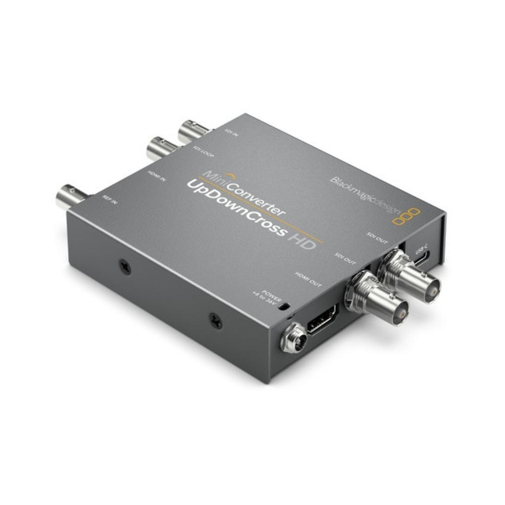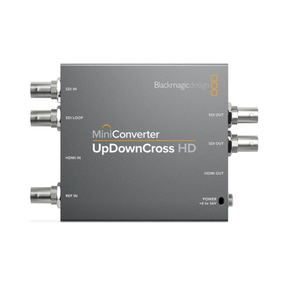 Use the Mini Converter UpDownCross HD from Blackmagic Design to automatically cross-convert between any SD and HD video format, with support for signals up to 1080p60. The converter incorporates one 3G/HD/SD-SDI input, two 3G/HD/SD-SDI outputs and one loop-through output, one HDMI input, and one HDMI output. This versatile converter supports scaling for computer DVI resolutions via its HDMI input, enabling you to connect HDMI computers to SDI projectors.