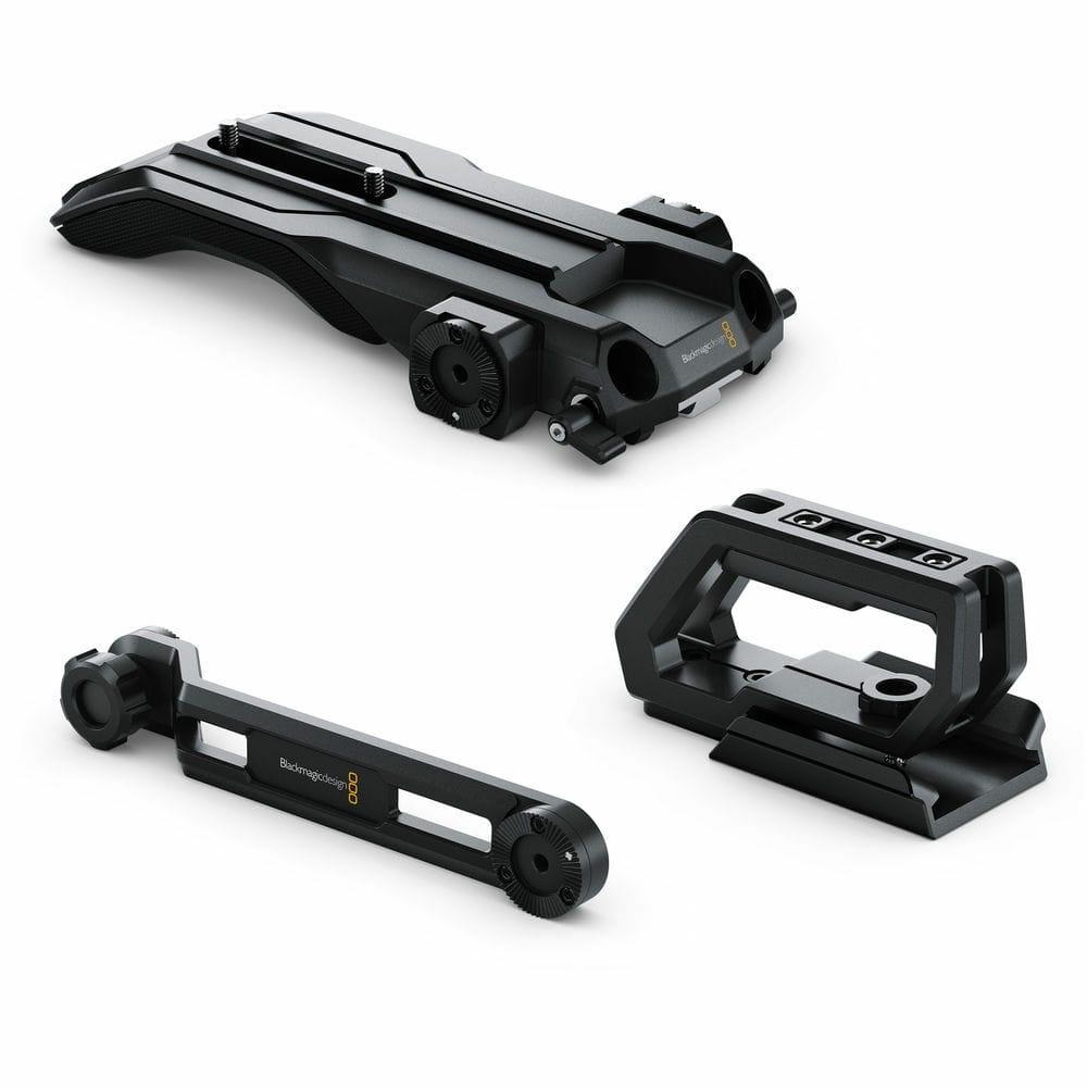 For ENG and documentary-style shooting, the Shoulder-Mount Kit designed for the Blackmagic Design URSA Mini provides a shoulder mount for you to comfortably rest the camera on your shoulder for long shooting sessions. Integrated into the shoulder mount are a quick-release compatible with VCT wedge plates, 15mm lightweight rod clamps, and rosettes on either side for mounting handles and other accessories. Also included in the kit is a top handle for low-mode shooting and for carrying the camera when not in use.