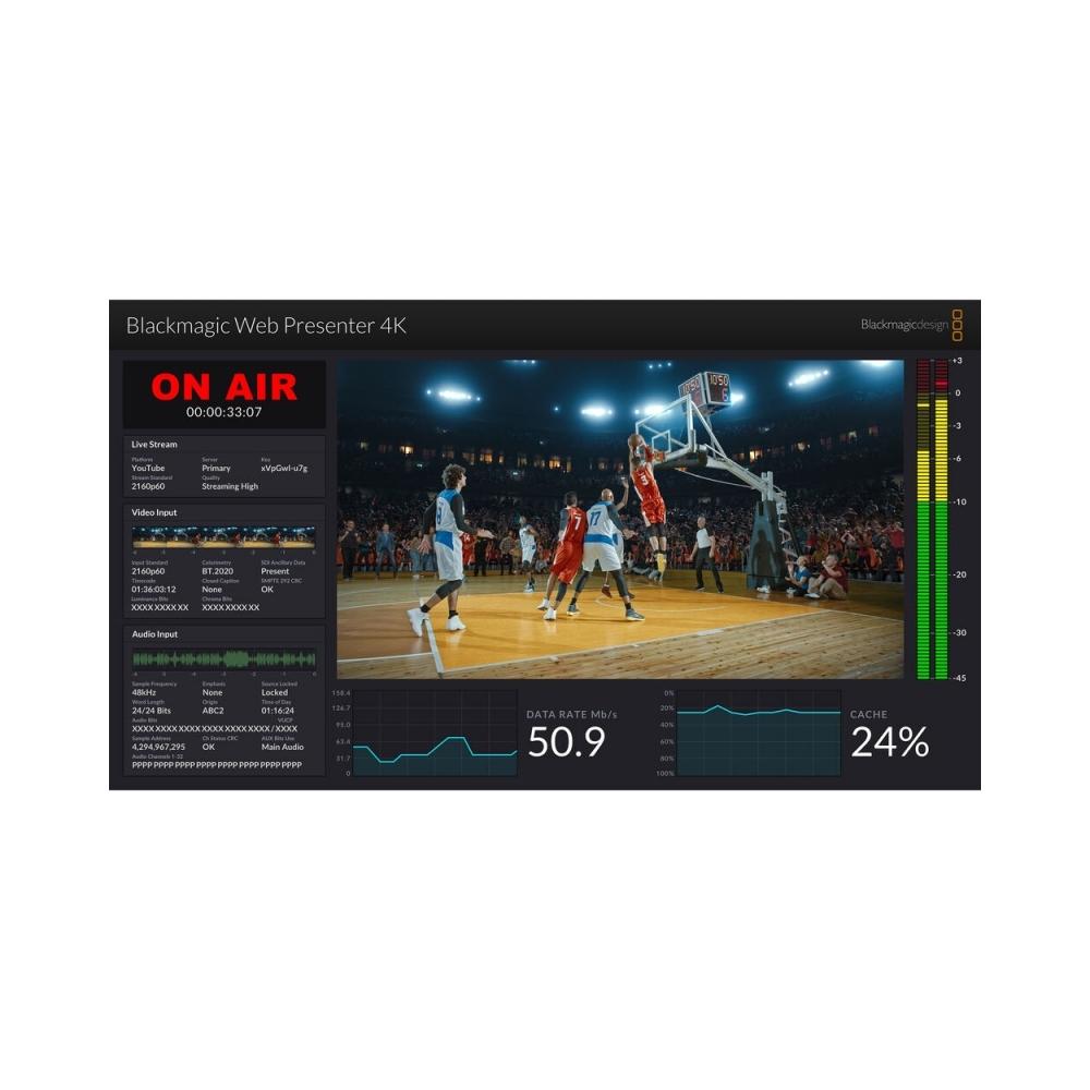 Traditional broadcast transmitters are critical equipment in a television station, however now the streaming server is just as critical because millions of viewers can be watching globally! To help, Blackmagic Web Presenter includes a feature rich technical monitoring output. The graphics based monitoring output includes a video view, audio meters with accurate ballistics, trend graphs for codec data rates and cache fill, plus a summary of the streaming settings and detailed SDI technical information. Plus the technical monitoring output works in full 1080 HD and outputs to both SDI and HDMI. That means you can use an SDI router for monitoring multiple units, or connect a simple HDMI TV!