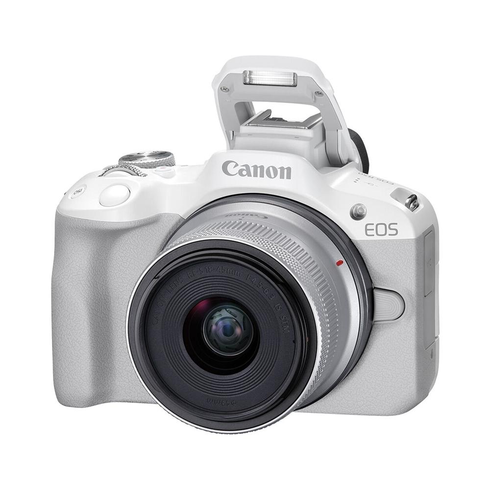 EOS R50內置彈出式閃光燈,其閃光指數約為6 (m, ISO100),並支援以E-TTL II閃燈測光。這閃光燈在低光環境下拍攝非常方便,亦可以在逆光時作補光用途。