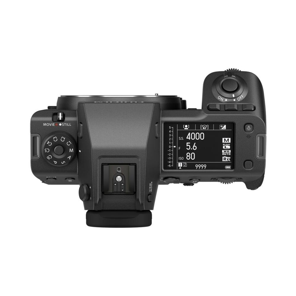 GFX100 II上有一個更突出的頂板肩部螢幕,採用重新設計的GUI,提高了可見性,增強了整體操控性。此外,頂板傾斜11°,有效避免使用者在查看資訊時移動眼球。