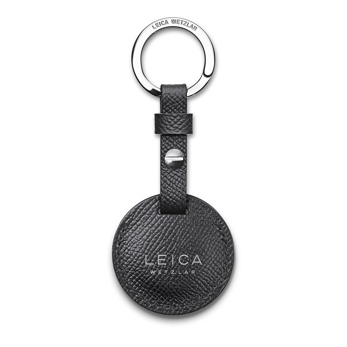 The AirTag Holder consists of a round leather piece with a slot for one AirTag, a leather strap and a metal ring for attaching the AirTag to a key ring, suitcase or bag. It is a stylish companion for everyday use and travel.