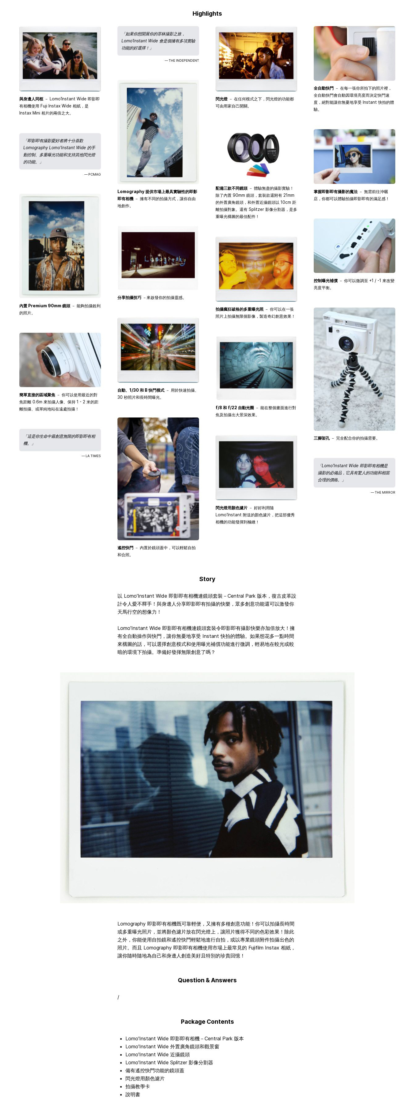 這部特別版即影即有相機設計靈感來自美國紐約 Central Park!更大的照片尺寸,以及配備三種特別的鏡頭,令即影即有攝影快樂亦加倍放大!\n以大片幅相紙捕捉眼前一切\n全自動操作與創意模式\n擁有外置廣角鏡、近攝鏡,以及 Splitzer 影像分割器\n簡單易用,更具備多款實驗功能\n使用市面上最常見的 Fujifilm Instax Wide 相紙