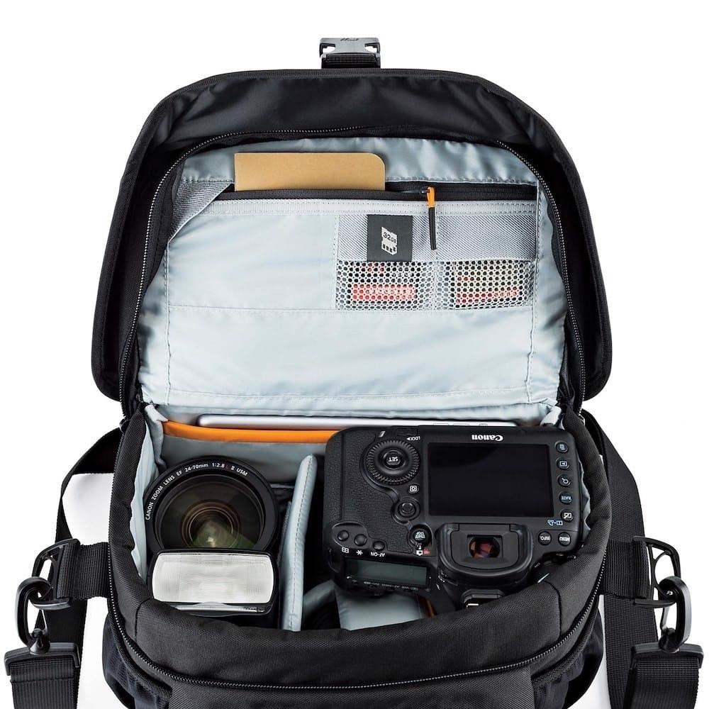 用於收納專業數碼單反相機和額外鏡頭的單肩相機包。\n可收納1台裝有24-105mm鏡頭的數碼單反相機,3~4枚額外鏡頭\n耐候性AW Cover™防雨罩,防水拉鍊和包覆式頂蓋設計\n靈活的內部分隔墊可提供定制化的器材保護\n可通過可調肩帶、加墊提手或拉桿箱固定帶攜帶\n頂蓋和背包外側的小口袋可存儲配件