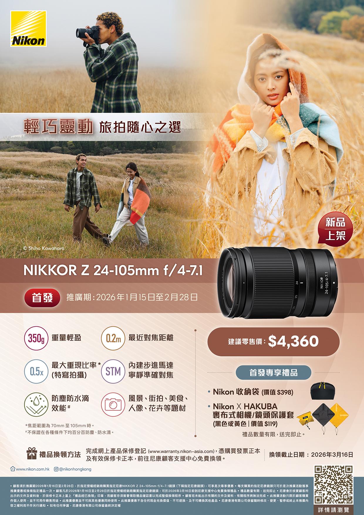 NIKKOR Z 24-105mm f/4-7.1 鏡頭專為捕捉日常即興時刻而設。透過靈活百搭的 24–105mm 變焦範圍,流暢地從廣闊風景切換到細膩人像。靠近至 0.2m 拍攝,獲得動人細節及柔和散景效果。僅重約 350 克,設計方便手持使用,非常適合在路途中拍攝 Vlog 內容。多功能的輕巧隨身裝備,準備好捕捉那些與你不期而遇的時刻。