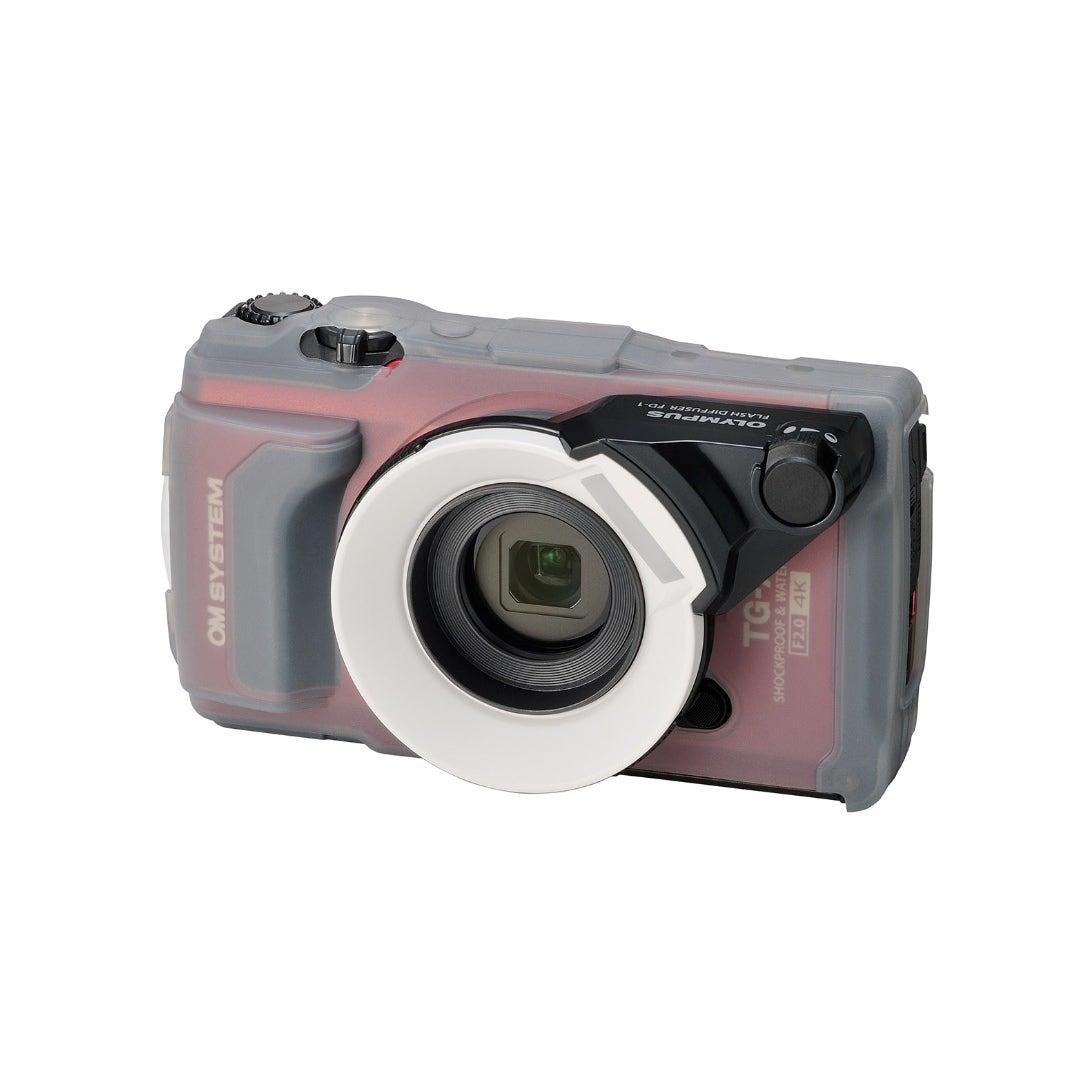 這款專為 TG-7 設計的矽膠護套可保護相機表面免受刮擦。它還提高了抓地力,即使在濕滑的情況下也能牢固地握住相機。安裝了矽膠套後,LG-1 環形 LED 燈導光裝置和 FD-1 閃光燈柔光罩也可以使用。