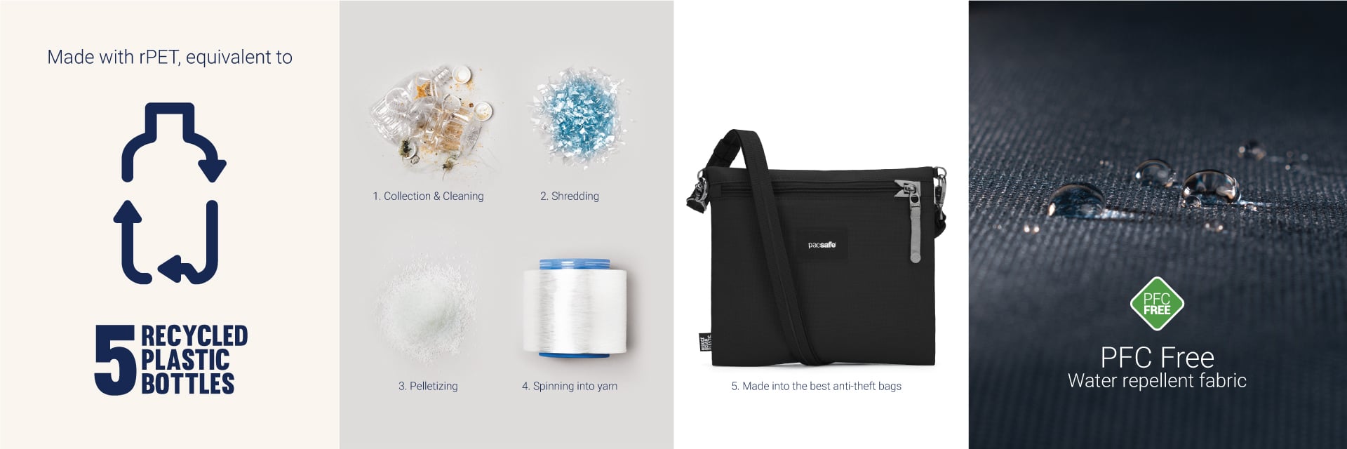 This product is made with post-consumer recycled polyester (rPET), equivalent to 5.0 recycled plastic bottles, and is treated with a 100% PFC-free water repellency.