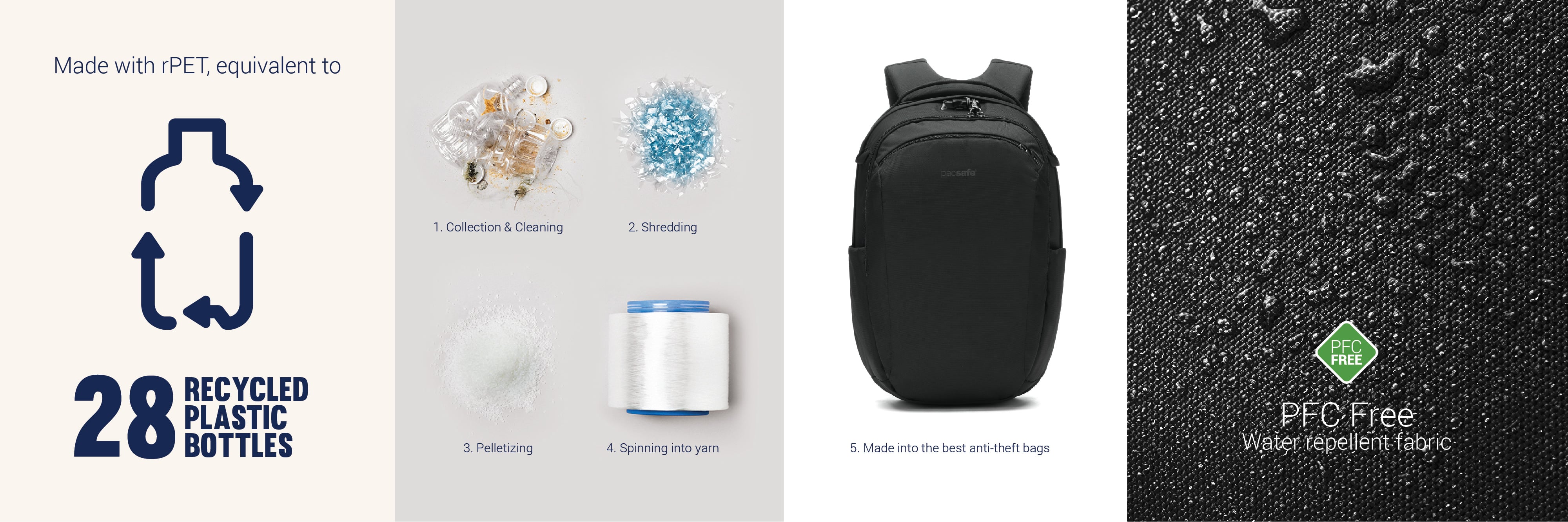 This product is made with post-consumer recycled polyester (rPET), equivalent to 28 recycled plastic bottles, and is treated with a 100% PFC-free water repellency.