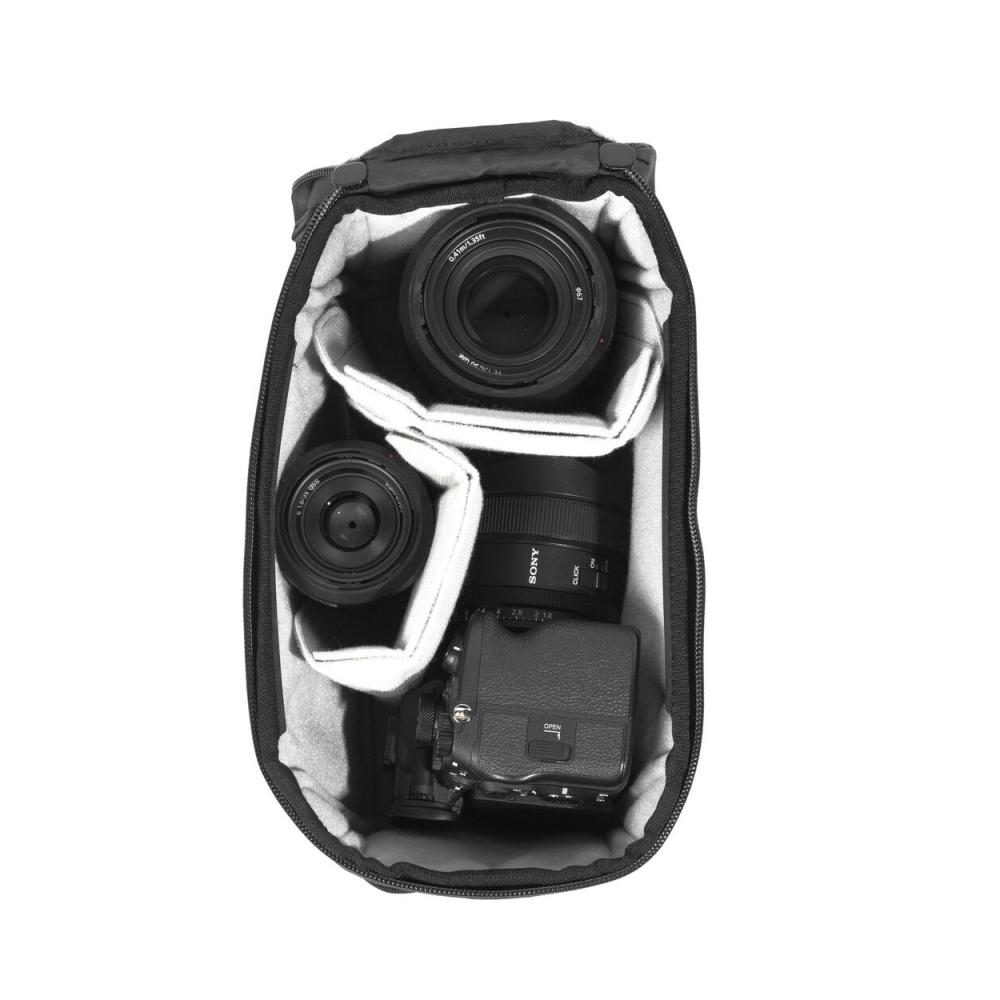 FlexFold dividers enable customizable organization and protection. Vertically stack items for maximal capacity. Floating pocket stores lens caps, filters, and other small items.