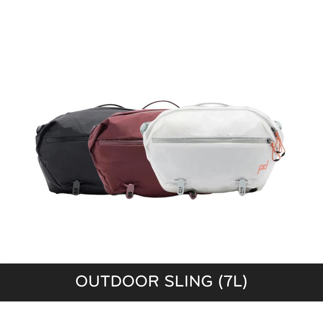 Sleek, ultralight, and ultra-versatile, the Peak Design Outdoor Sling 7L is an adventure companion that you can put to work during a backcountry trek or a city commute—wherever you take it, it has the clean form and brilliant functionality that feels right for the job. A quick-adjusting padded shoulder strap with custom glass-reinforced nylon hardware allows cross-body carry or waist carry, and the include Cord Hook™ Stabilizer Cord pops on to enable use during cycling and active movement. The lightweight Terra Shell™ 210D ripstop 100% recyced nylon exterior is abrasion resistant and weatherproof thanks to a PU-coating, PFAS-free water resistance treatment, and burly #5 weatherproof UltraZips™. There's a padded drop pocket for your phone with magnetic closure, an external quick-access zip pocket, and 8 smaller mesh internal pockets for batteries, SD cards, keys, glasses, and other small stuff. Carry things like an umbrella, jacket, or travel tripod externally using 2 elastic Cord Hook™ Gear Loops. Those Gear Loops can also be used to compress the bag so that it retains it's clean profile with smaller payloads. Fair Trade Certified and 100% carbon neutral.