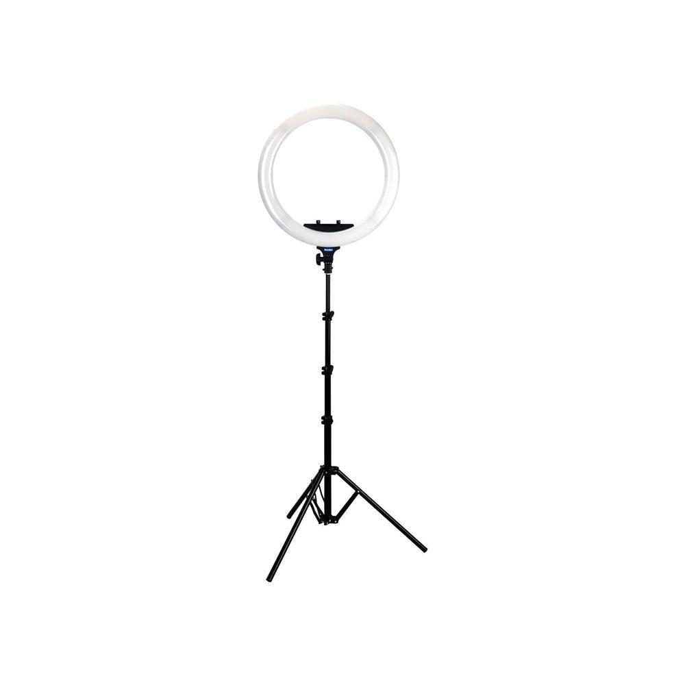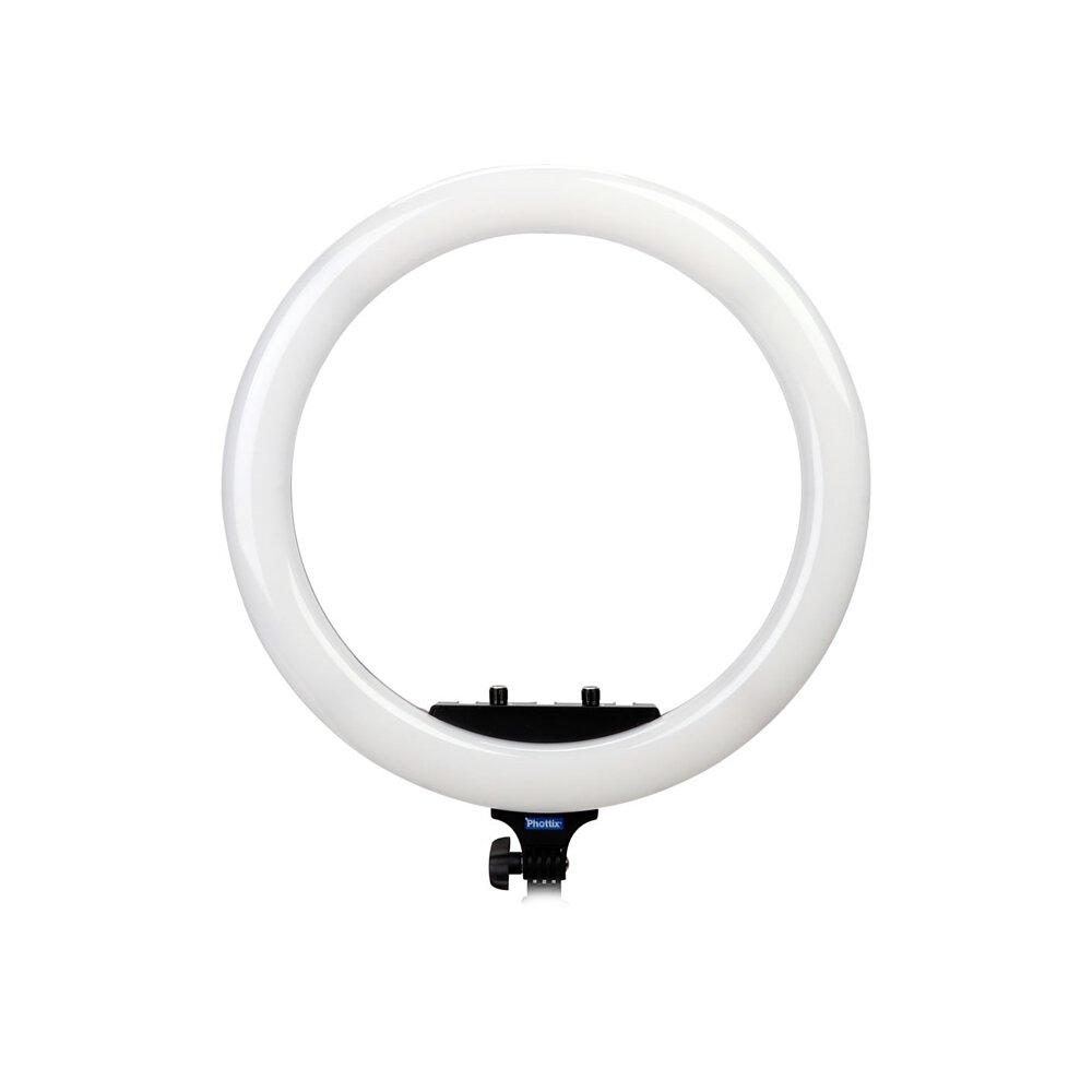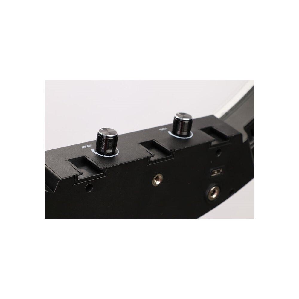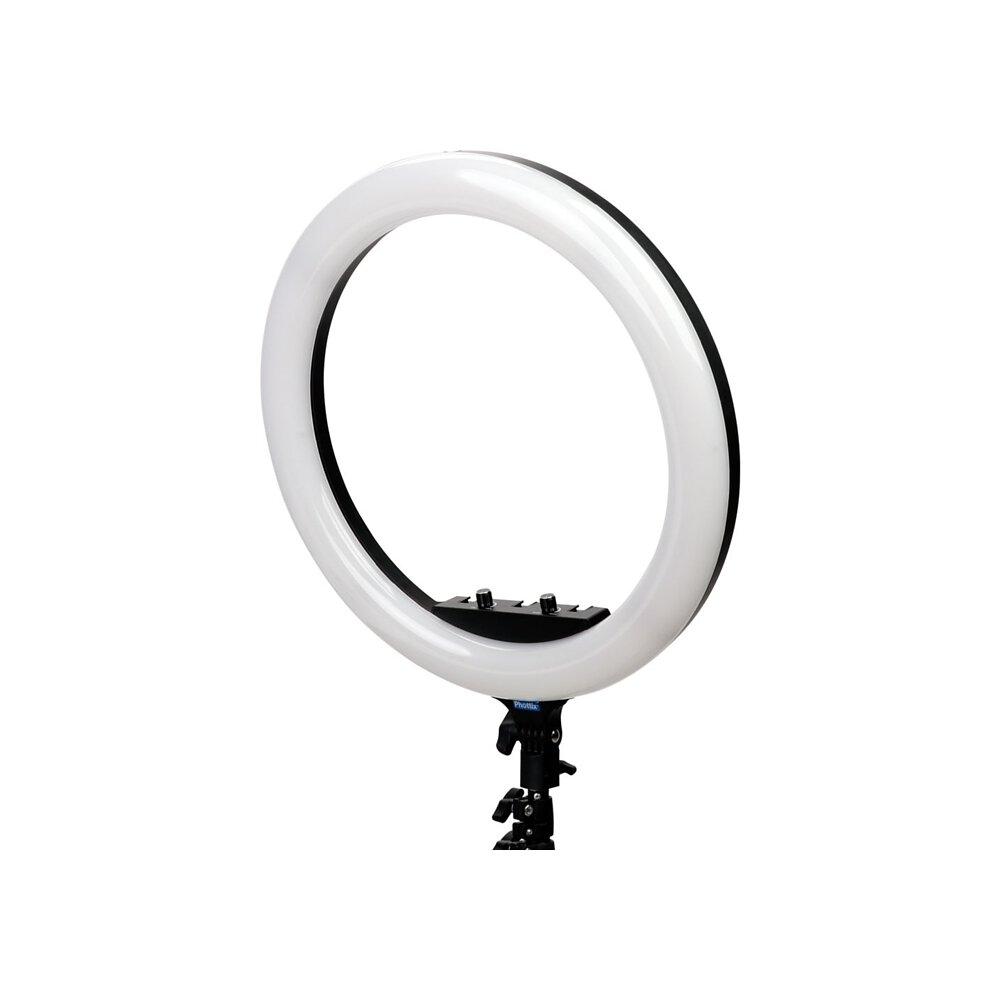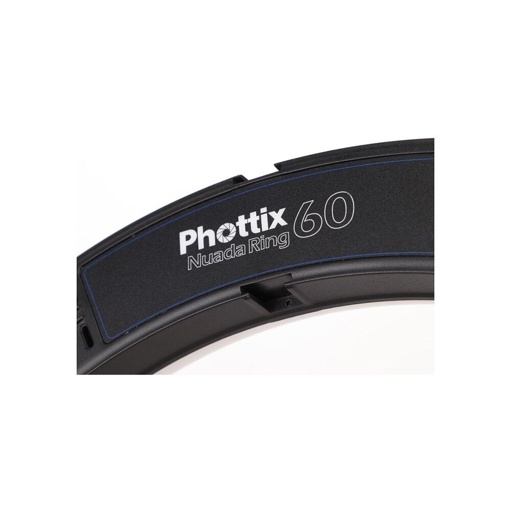 The right light can make all the difference on social media and live streaming. The Phottix Nuada Ring 60 is the perfect light setup for photography, videography, makeup artists, livestream shooting and smartphone content creation. The 19 inch (49cm) ring design is made up of 216 pieces of 5600K cool color LED beads and 216 pieces and 3200K warm color LED beads, with a total output of 48W. The LED body has 5 cold-shoe mounts, which includes a camera bracket and a smartphone clip. The back panel also has 1 x USB output which can provide power to a smartphone or camera. The Nuada Ring 60 runs on Two Sony-Compatible NP-F750/ 960 Batteries (not included), which makes it perfect for on-location work. An AC adapter is also included. The Nuada Ring 60 also includes a light-weight collapsible light stand and a carry bag for easy travel and on-location setup.