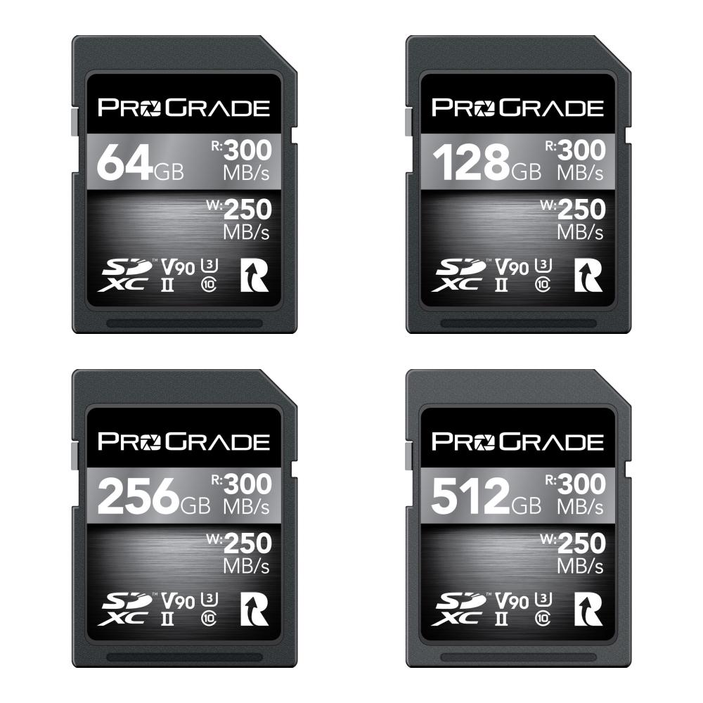 ProGrade Digital 的 UHS-II SDXC V90 存儲卡具有每張卡高達 512GB 的存儲容量,並利用 UHS-II 總線支持 300 MB/s 的最大讀取速度和 250 MB/s 的最大寫入速度。此卡還設計有 V90 視頻速度等級等級,可保證至少 90 MB/s 的最低寫入速度,使該卡可用於產生豐富數據流的數碼單反相機、無反光鏡相機、攝像機和數字電影攝像機,包括 6K、5K、4K、UHD 4K 和高比特率 MPEG-4 視頻。它也非常適合原始照片和快速連拍。