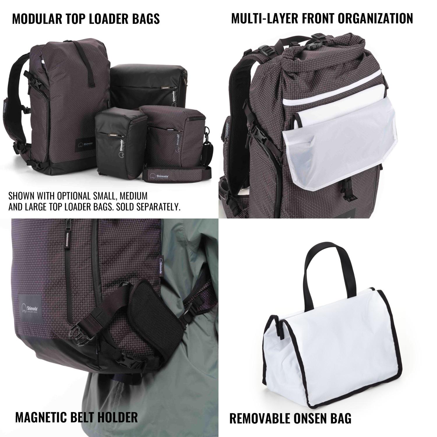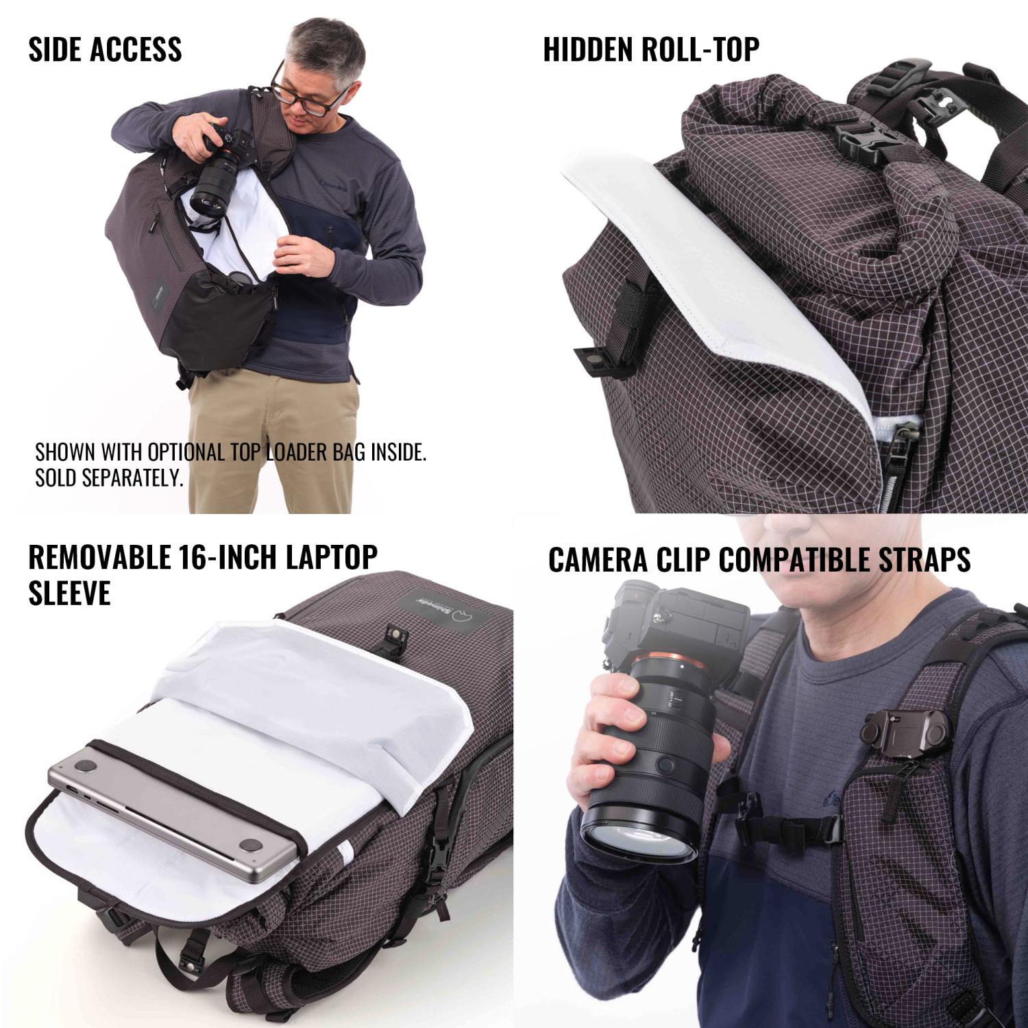 As part of Shimoda's Side Series collection, the Sidecountry can fit Shimoda's Small, Medium or Large Top Loader inserts, allowing users to pack only the camera gear they need, while still having enough room for backcountry essentials in a sleek lightweight mountain camera pack. STARTER KIT INCLUDES MEDIUM TOP LOADER BAG.