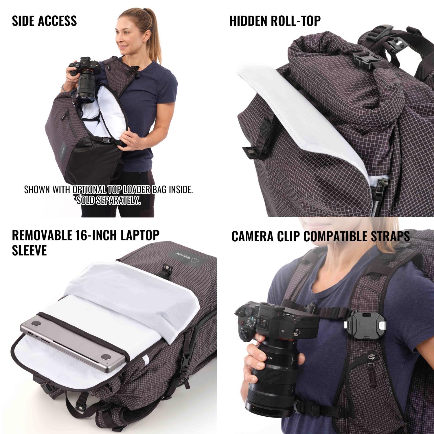 As part of Shimoda's Side Series collection, the Sidecountry can fit Shimoda's Small, Medium or Large Top Loader inserts, allowing users to pack only the camera gear they need, while still having enough room for backcountry essentials in a sleek lightweight mountain camera pack. STARTER KIT INCLUDES MEDIUM TOP LOADER BAG.