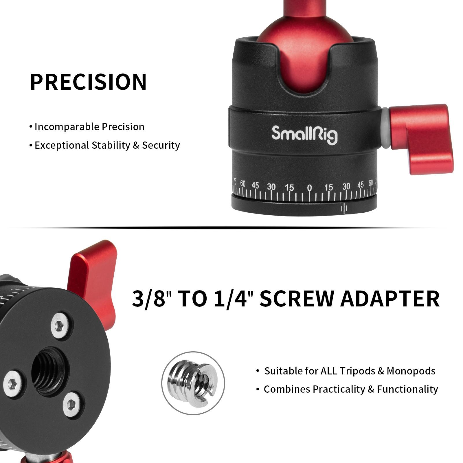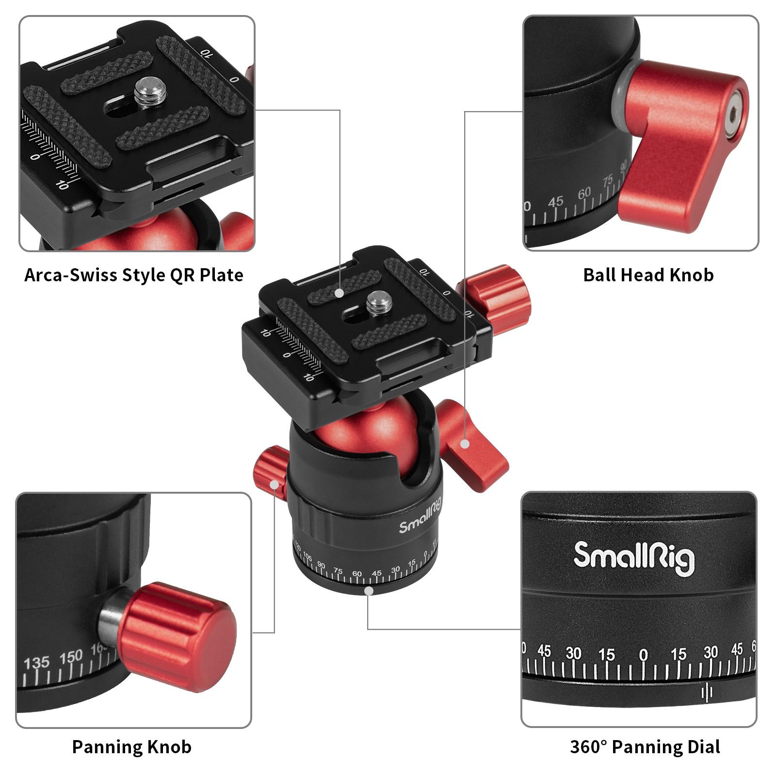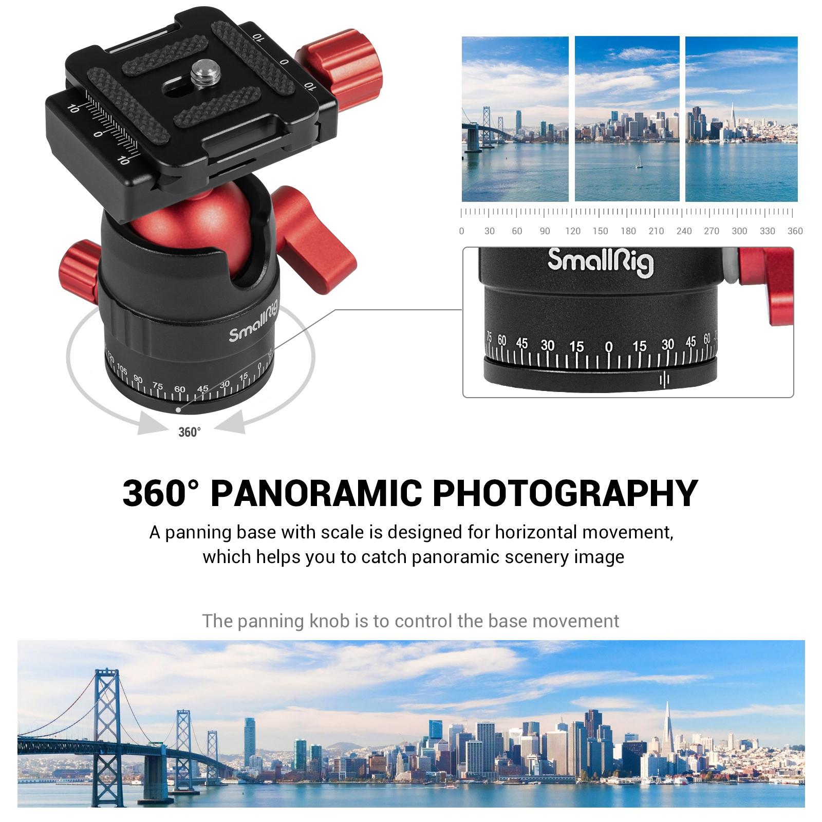 SmallRig Aluminum Panoramic Ball Head 3034, which is made of aluminum, is solid and secure. With a safety payload of 5kg, it is the perfect head for amateur photographers who need a quick, smart, and simple head for their compact DSLR, mirrorless camera, smartphone, action camera, or other devices. It’s compatible with most of the photography tripods or monopods. The ball head with accurate calibration supports 360° panoramic rotation for panoramic shooting, -90°/+45° front tilt, and -50°/+50° lateral tilt for multi-angle adjustment, including horizontal shooting and vertical shooting. It comes with a standard Arca-Swiss plate compatible with other Arca-Swiss clamps to ensure a quick mount/dismount of your device.