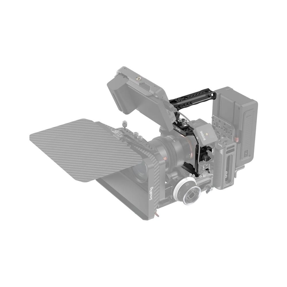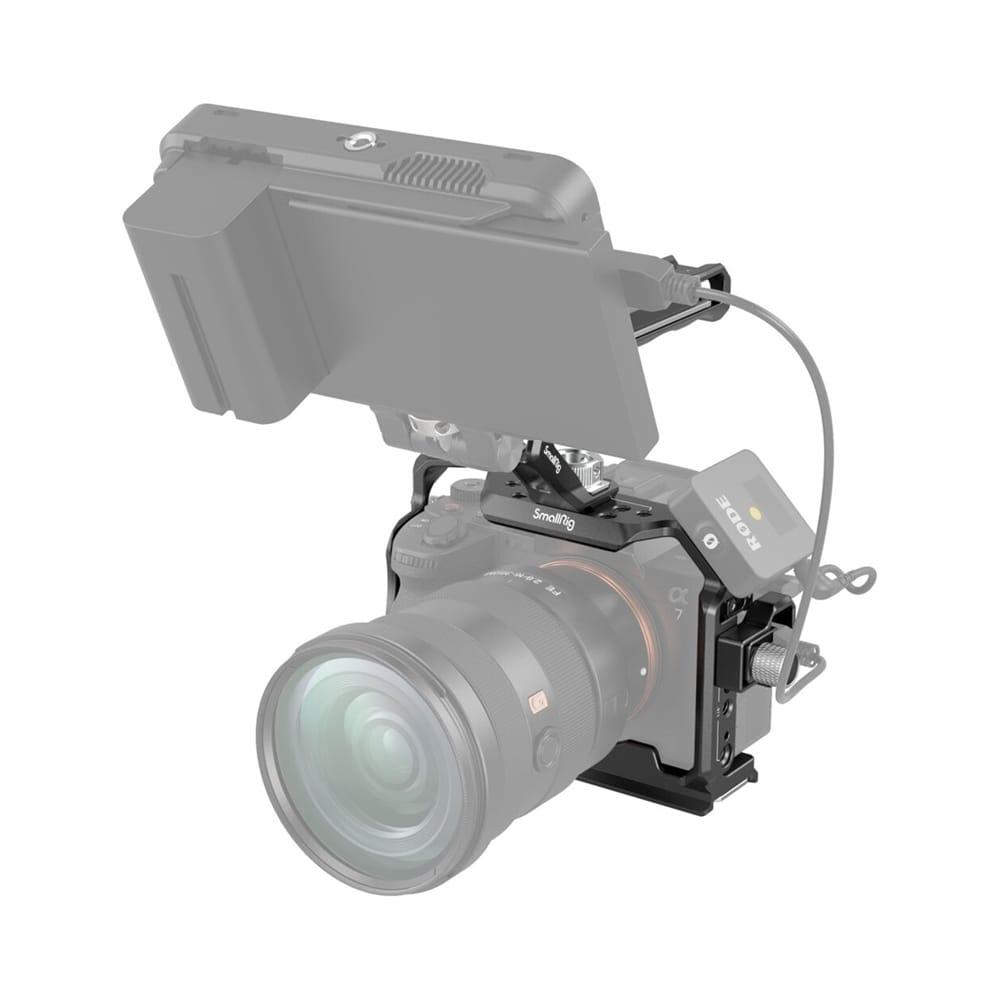 SmallRig Basic Cage Kit for Sony Alpha 7R V / Alpha 7 IV / Alpha 7S III 3668B is designed to facilitate low-angle shots and protect the camera while offering a wide range of accessory mounts. It includes a cage, an HDMI cable clamp, and a top handle. The top handle feels comfortable and enables easy carrying at the low-angle shot. 1/4"-20 threaded holes, ARRI 3/8" -16 locating holes, cold shoes and NATO rails and QD socket support monitor mount 2294, microphones, LED lights, monitor mount 2903B, NATO accessories. The HDMI cable clamp, mounted onto the left side of the cage via one 1/4"-20 screw and two locating pins, prevents deflection and fixes cables with a thumbscrew to protect interfaces and ensure stable signal transmission. In addition, holes on both sides of the cage allow for attaching hand straps. The cage comes with a built-in magnetic flat-head screwdriver & hex spanner for easy disassembly and assembly.