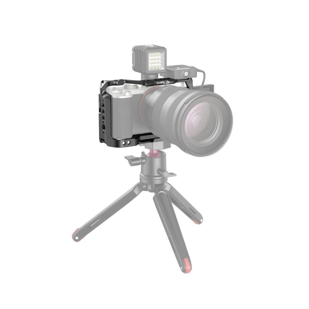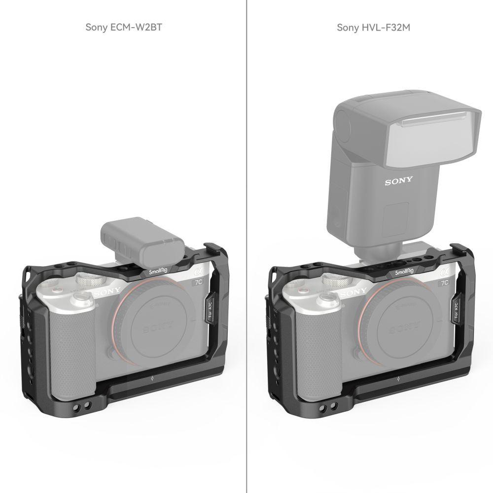 SmallRig Cage for Sony Alpha 7C 3081B is designed to provide mounting points for accessories like monitors, microphones, and LED lights in professional video shooting. The cage secures to the camera with a 1/4"-20 screw at the bottom. To further prevent twisting, can also use the right side lock by pushing up the slider and securing the attached small screw to the strap hole of the camera. The cage features multiple 1/4''-20 threaded holes and ARRI 3/8" -16 locating holes, allowing to mount Top Handle 2165, Cold Shoe Extension 2879, and Tripod BUT2664 for vlog shooting; the top built-in cold shoe suits microphones, LED lights; the bottom built-in Arca-type quick release plate fits DJI RS 2 / RSC 2 / RS 3 / RS 3 Pro gimbals for quick switch between handheld shooting and stabilizer shooting. Besides, there is a built-in magnetic screwdriver on the bottom of the cage for an easy user experience. The cage fits seamlessly the camera without blocking the battery door, screen, card slot, and buttons. Fully maintains the original functions of the camera.