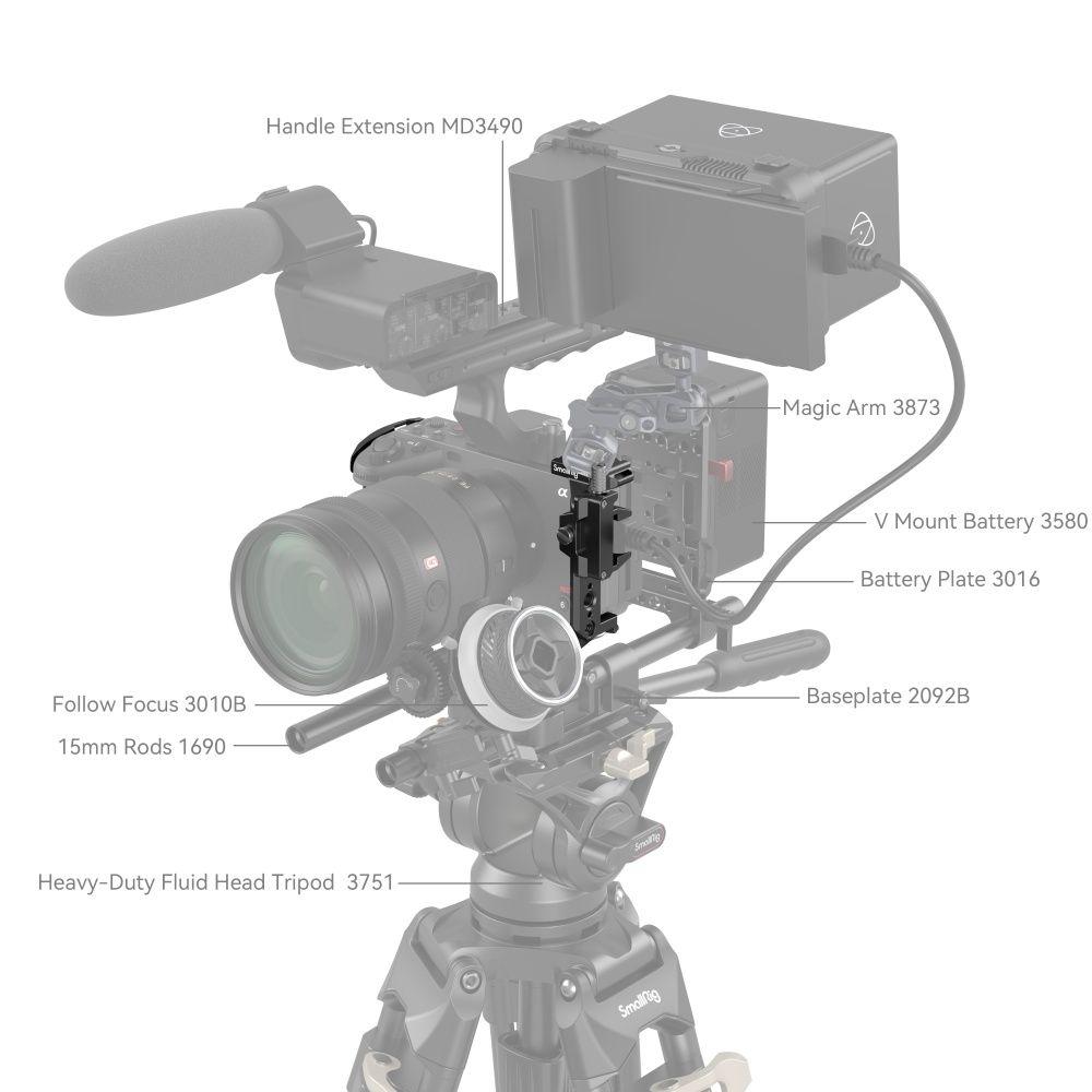 SmallRig SonyFX30 / FX3拓展框 4183是為機身提供配件拓展介面及貼身保護而設計。拓展框採用模組化設計,包含頂部滑條模組和U型拓展框模組。頂部滑條模組透過兩顆1/4”-20螺絲固定,拆卸後可相容原廠XLR上手提;U型拓展框模組透過兩側及底部1/4”-20螺絲固定,穩固不偏轉。與機身接觸面均內建保護墊片,防止相機刮傷。電池倉位置增加開合扳手設計,更貼合機身曲線,解決小指放置問題提升手持握感。配備專用HDMI線夾保護接口,確保拍攝過程中的訊號穩定。拓展框內建多個1/4”-20孔可拓展魔術手2070;阿萊定位孔可拓展上手提2165C進行手持拍攝、也可拓展監視支架2903B轉接監視器;頂部滑條可拓展錄製上手提3322,左側滑條側手柄2187B;左上角和左側1/4”-20定位孔可安裝管夾3598拓展跟焦器;右側鏡頭中心留有兩顆1/4”-20孔,豎拍時轉接快裝板,防止偏轉;內建冷靴接口,可安裝麥克風、補光燈等設備;底部QD接口可相容QD肩帶;底部採用阿卡快裝板,相容於DJI RS 2 / RSC 2 / RS 3 / RS 3 Pro的同時,也可適應DJI RS 2/RSC 2穩定器快裝板(墊高板)和阿卡板3154,輔助相機搭配穩定器拍攝。底部內建磁吸扳手,方便拆裝,隨取隨用。