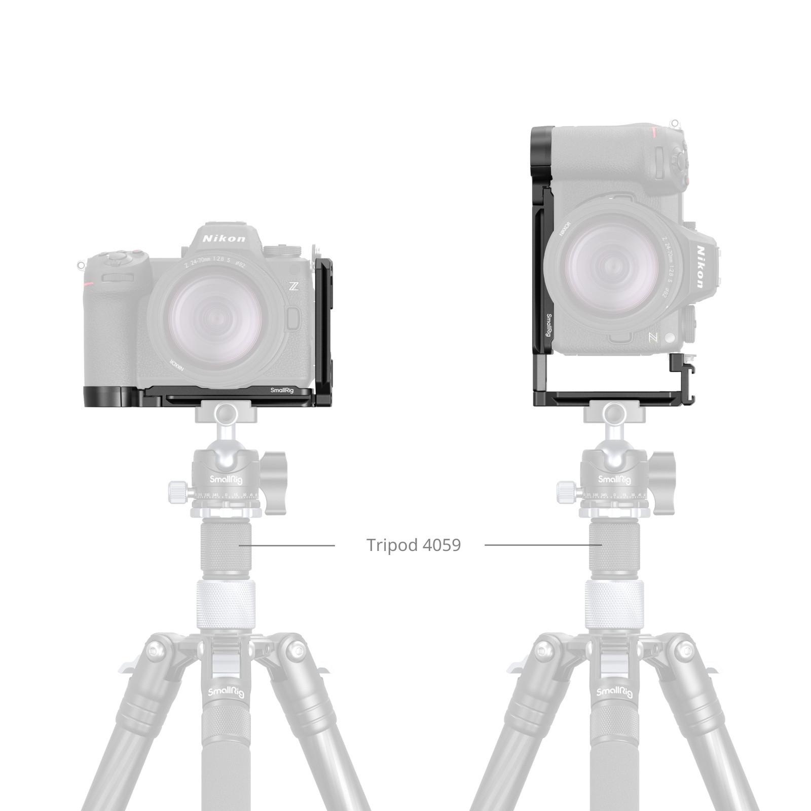 SmallRig L-Shape Mount Plate for Nikon Z 6III 4523 is designed to facilitate a quick transition between landscape and portrait orientations, enhancing both shooting versatility and camera grip. Three-point locking system ensures stability and prevents twisting by securing the camera with a 1/4"-20 screw at the base, a locating block, and the left shoulder strap ring, while integrated pads prevent the camera from scratching. The locating block with the built-in cold shoe mount provides support to stabilize the cage and prevent distortion after extending the side plate in portrait mode. It is also compatible with accessories with cold shoe mounts, such as microphones (ID 3487), LED video lights (ID 3286B), image transmission systems, flashlights, etc., providing a lightweight solution to photography or shooting. The side plate can be extended by 22.5mm (0.9in) for convenient cable routing in portrait orientation. Integrated Arca-Swiss quick-release plate on the base supports Arca-type tripod (ID 4353, 4060) or DJI RS 2 / RSC 2 / RS 3 / RS 3 Pro / RS 4 / RS 4 Pro gimbals. The bottom features built-in 1/4"-20 and 3/8"-16 threaded holes, allowing seamless compatibility with side handles (ID 2093, 3847) for handheld vertical shooting solutions, as well as the tripods (ID 3989, 3751). The bottom is equipped with a strap hole, compatible with wrist/shoulder straps (ID 3848, 2456). A built-in QD interface supports shoulder straps (ID 4118). Additionally, the side panel includes a 1/4"-20 locating hole for accessories such as magic arms (ID 3875). The hinge arm at the battery compartment fits the camera curves and improves its grip comfort. The plate features a built-in magnetic flat wrench at the bottom for easy disassembly and assembly.