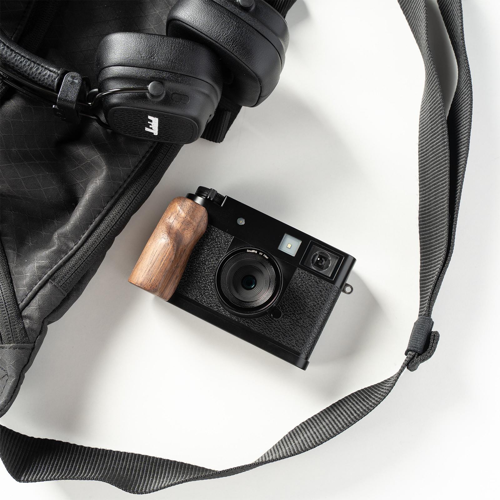 SmallRig L-Shaped Mount Plate with Wooden Handle for FUJIFILM X half (Charcoal Silver) 5394 is designed to enhance camera grip comfort. It securely attaches to the camera using a 1/4"-20 screw at the base, with integrated silicone pads to protect against scratches.