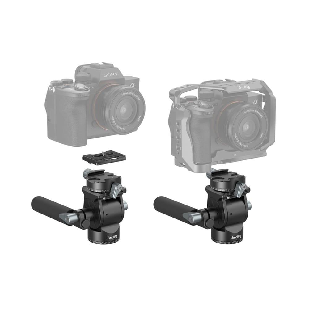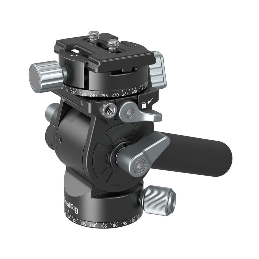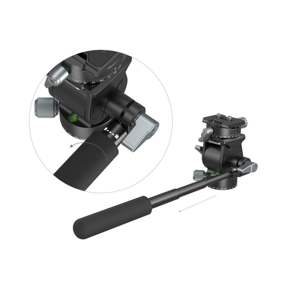 SmallRig Lightweight Fluid Video Head 3457B is specially designed for videoing and photography. It features panoramic panning and is Arca-swiss QR system compatible, allowing being fitted directly with Arca-swiss cages and L brackets. You may adjust its center of gravity back and forth by turning the side knob when using large lenses or mounting the camera horizontally. The head comes with a removable telescopic handle that supports a 360° swivel and one 1/4''-20 threaded hole to fit a magic arm for such devices as a monitor, microphone, image transmitter, or even camera. A built-in spanner is also included for removing or installing quick-release plates.