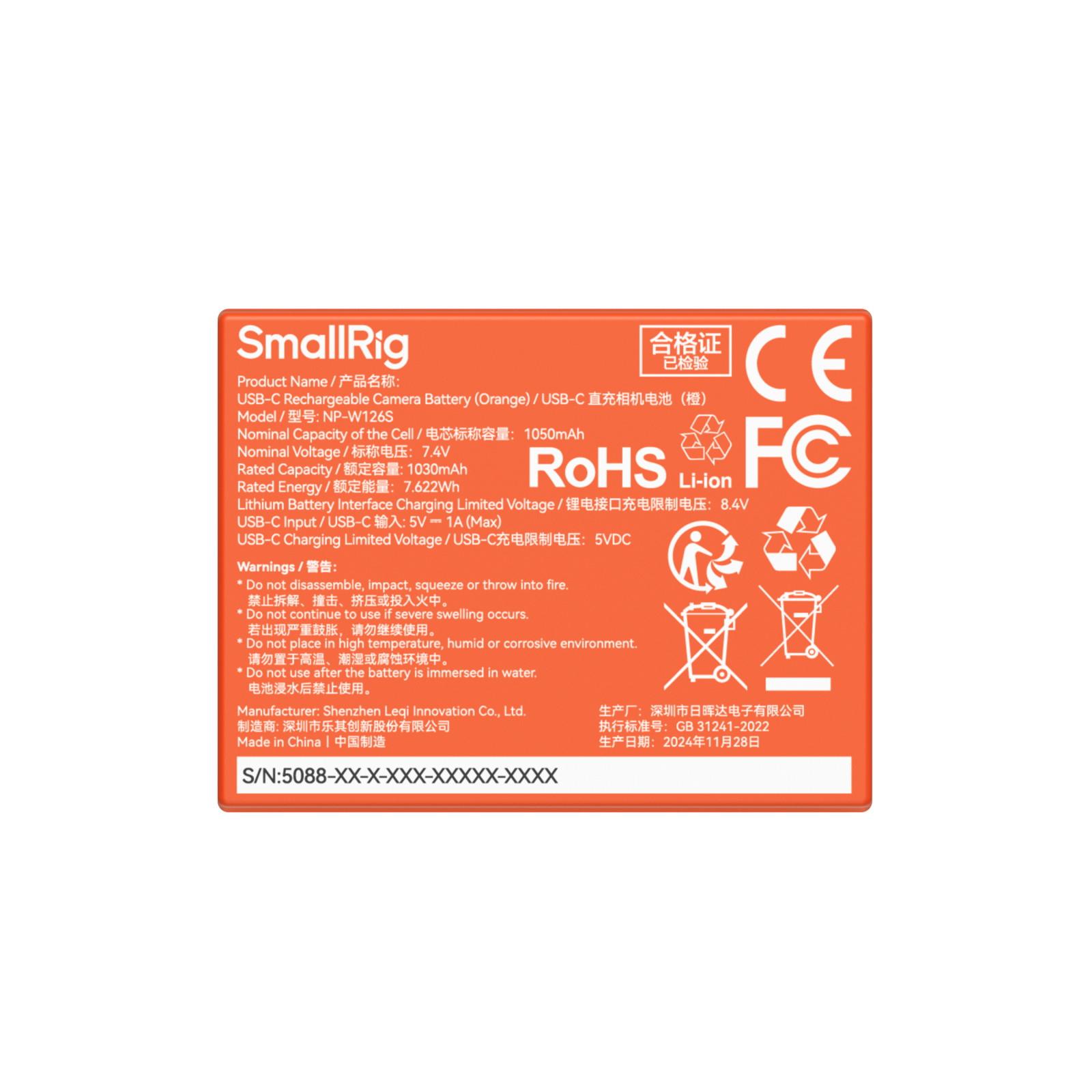 SmallRig NP-W126S USB-C Rechargeable Camera Battery (Orange) 5088 allows being charged via a power bank, power strip, car charger, or other special chargers. With high-current charging (5V 1A) and 1050mAh nominal capacity, you can make the battery full in 2.5 hours and run for a longer time. Fully decoded without pop-ups, this visually distinctive battery features frosted ABS and PC shells, which are fire-resistant and durable. It is exactly the same size as the original camera battery, hence no worries about it getting stuck.