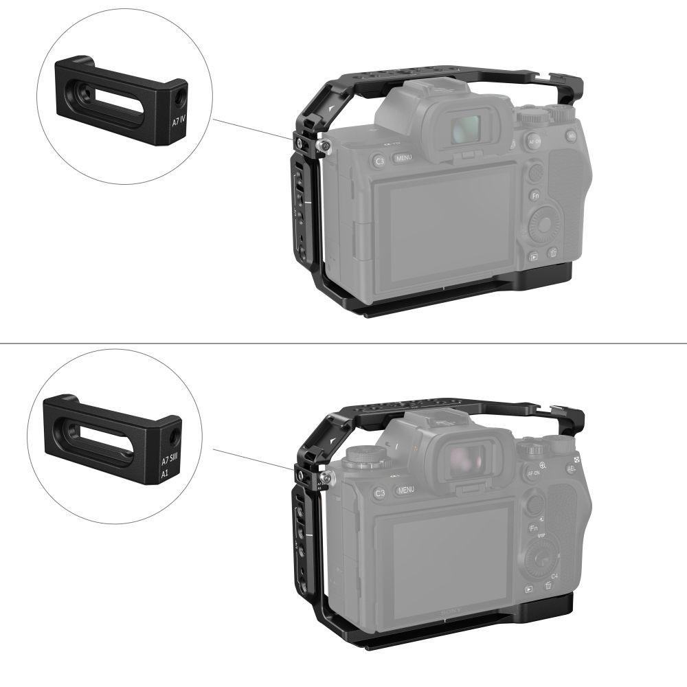 SmallRig Advanced Cage Kit for Sony Alpha 7R V / Alpha 7 IV / Alpha 7S III 3669C is designed to reduce arm load and increase stability during handheld shooting, while offering a wide range accessory mounts. It includes a cage, a HDMI cable clamp, a top handle and a side handle. The top handle feels comfortable and enables easy carrying and at low-angle shot. The side grip features a silicone insert for better grip and more stable two-handed shooting. 1/4"-20 threaded holes, ARRI 3/8" -16 locating holes, cold shoes and NATO rails support monitor mount 2294, microphones, LED lights, monitor mount 2903, NATO accessories. The HDMI cable clamp, mounted onto the left side of the cage via one 1/4"-20 screw and two locating pins, prevents deflection and fixes cables with a thumbscrew to protect interfaces and ensure stable signal transmission. In addition, holes on both sides of the cage allow for attaching hand straps. The cage comes with built-in magnetic flat-head screwdriver & hex spanner that facilitate disassembly and assembly.