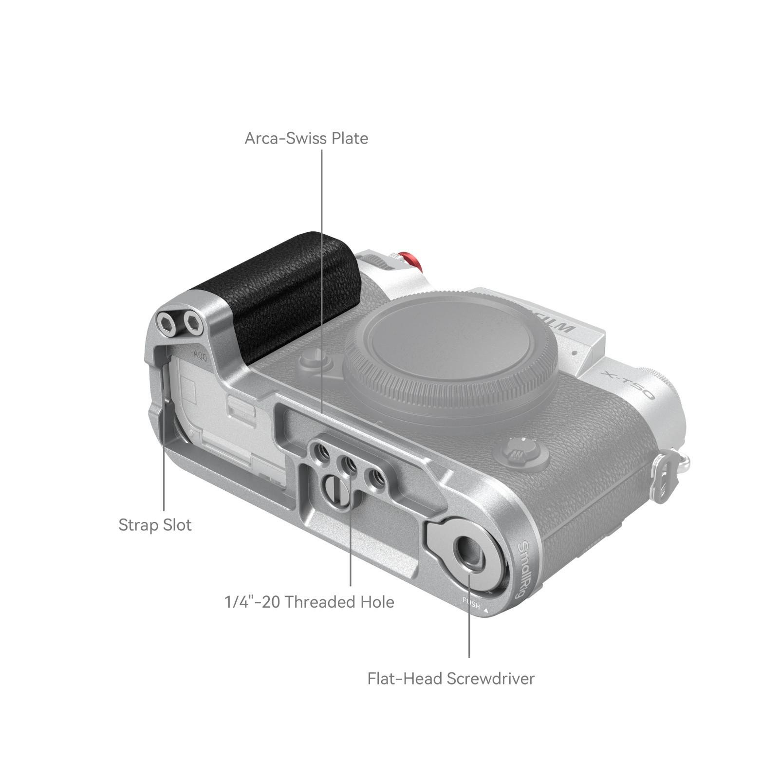 SmallRig Silicone L-Shape Grip for FUJIFILM X-T50 (Black) 4712 / (Sliver) 4713 is designed to improve the camera grip. The L-Shape Grip mounts to the camera with a 1/4"-20 screw at the bottom, and the built-in silicone pads prevent scratches. The texture and color of the grip perfectly match with FUJIFILM X100VI / X100V. The built-in Arca-Swiss quick-release baseplate allows for easy and fast Arca-type tripod assembly and disassembly. Four 1/4"-20 threaded holes at the bottom to attach Manfrotto-type plates and tripods. Strap slot for Wrist Strap (ID: 3848). The built-in flat wrench on the bottom for easy accessory assembly and disassembly. The grip comes with the exclusive hot shoe cover imprinted with the “FUJIFILM” sound wave and the year of foundation as our tribute to FUJIFILM. It also comes with a shutter release button to ensure a soft and comfortable finger touch.