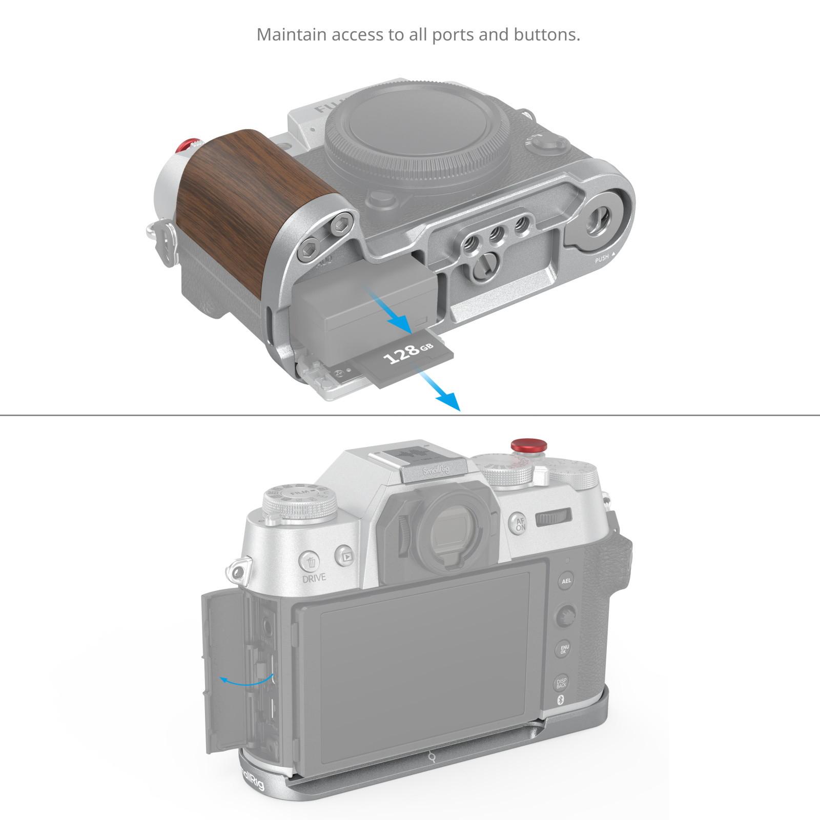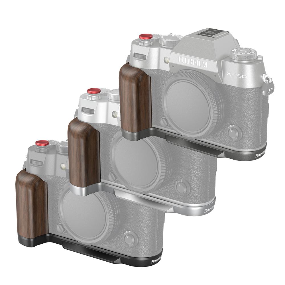 SmallRig Wooden L-Shape Grip for FUJIFILM X-T50 (Sliver/Charcoal Silver/Black) 4735/4736/4784 is designed to improve the camera grip. The L-Shape Grip mounts to the camera with a 1/4"-20 screw at the bottom, and the built-in silicone pads prevent scratches. The handgrip is made of natural solid wood, elegant with a rich, natural feel, and designed ergonomically to enhance the grip feeling. The built-in Arca-Swiss quick-release baseplate allows for easy and fast Arca-type tripod assembly and disassembly. Four 1/4"-20 threaded holes at the bottom to attach Manfrotto-type plates and tripods. Strap slot for Wrist Strap (ID: 3848). The built-in flat wrench on the bottom for easy accessory assembly and disassembly. The grip comes with the exclusive hot shoe cover imprinted with the “FUJIFILM” sound wave and the year of foundation as our tribute to FUJIFILM. It also comes with a shutter release button to ensure a soft and comfortable finger touch.