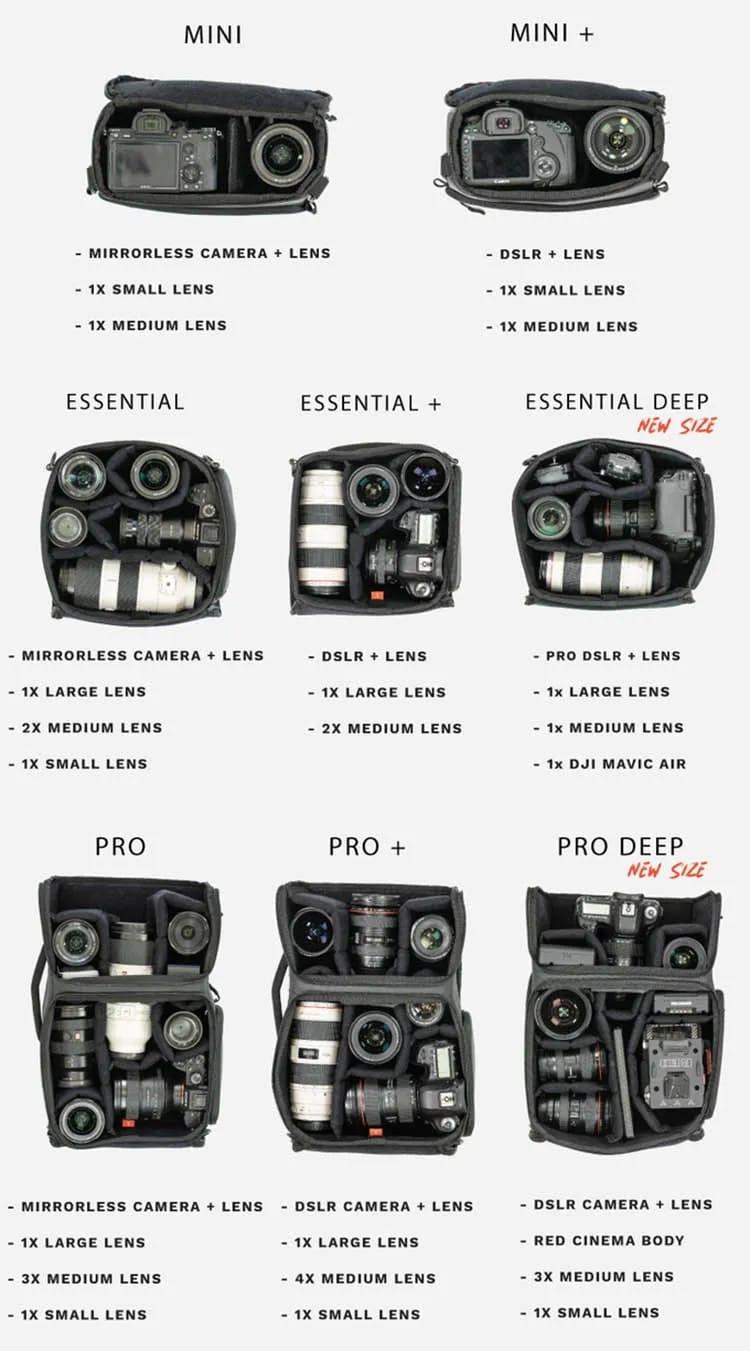 Essential Camera Cube™能與 PRVKE 21L整合,内有2個長隔板、3個短隔板與3個彈性帶。適合小型相機或小型的無反光相機。能夠容納:1個機身、3個鏡頭、2個電池。