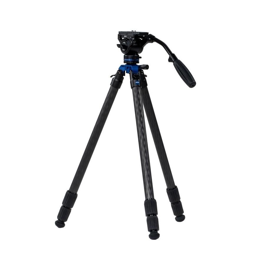 Professional tripod with a fluid video head and ZEISS branding on a white background.