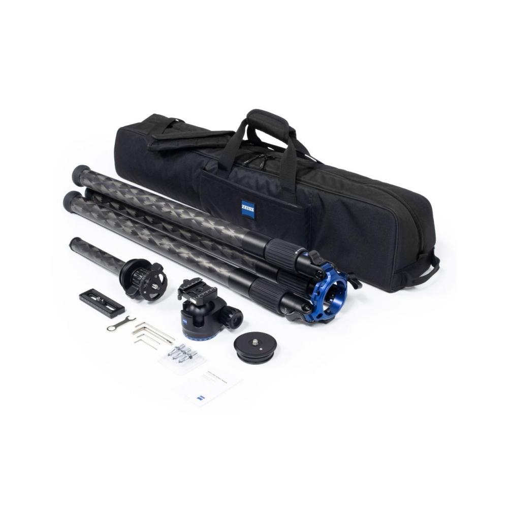 • Carbon fiber tripod kit with multiple components, including a tripod head, mounting accessories, instruction manual, and a black carrying case featuring the ZEISS logo.