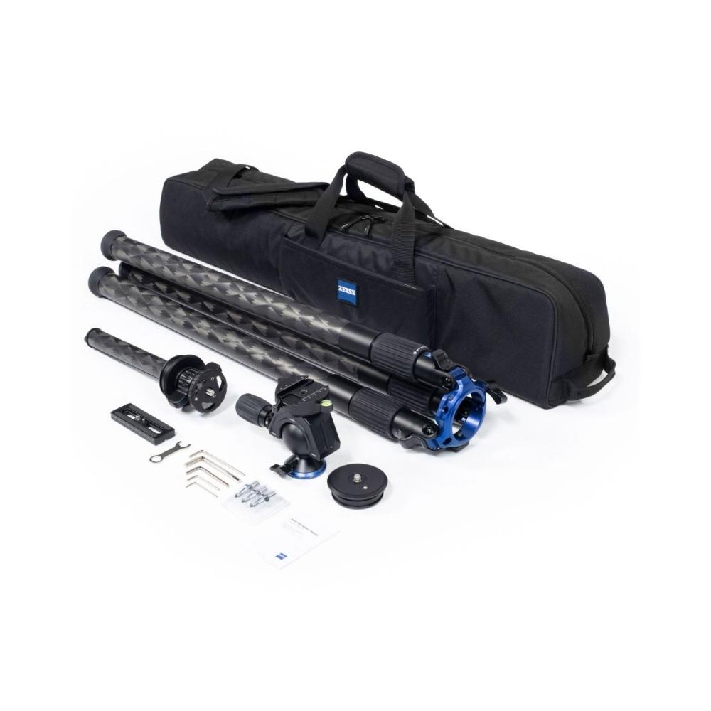 • Carbon fiber tripod kit with multiple components, including a tripod head, mounting accessories, instruction manual, and a black carrying case featuring the ZEISS logo.