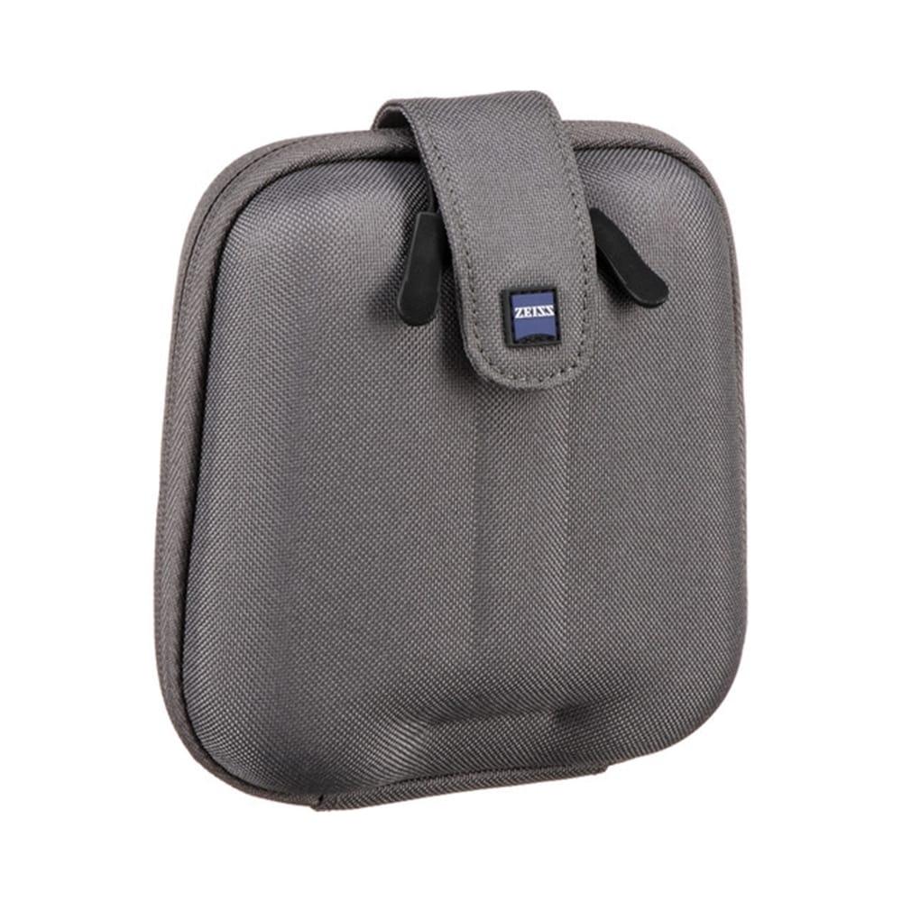 Front view of a compact black ZEISS binocular with red-tinted lenses on a white background.