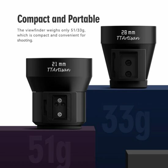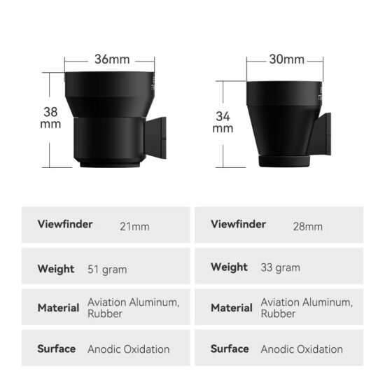 - 用於Ricoh GR 或其他帶有冷靴座的相機(Leica 旁軸相機、舊式菲林機)\n - 21mm / 28mm兩個版本\n - 光學玻璃透光性好,多重優質鍍膜\n - 陽極氧化鋁,目鏡上加有橡膠圈\n - 僅重51 / 33g